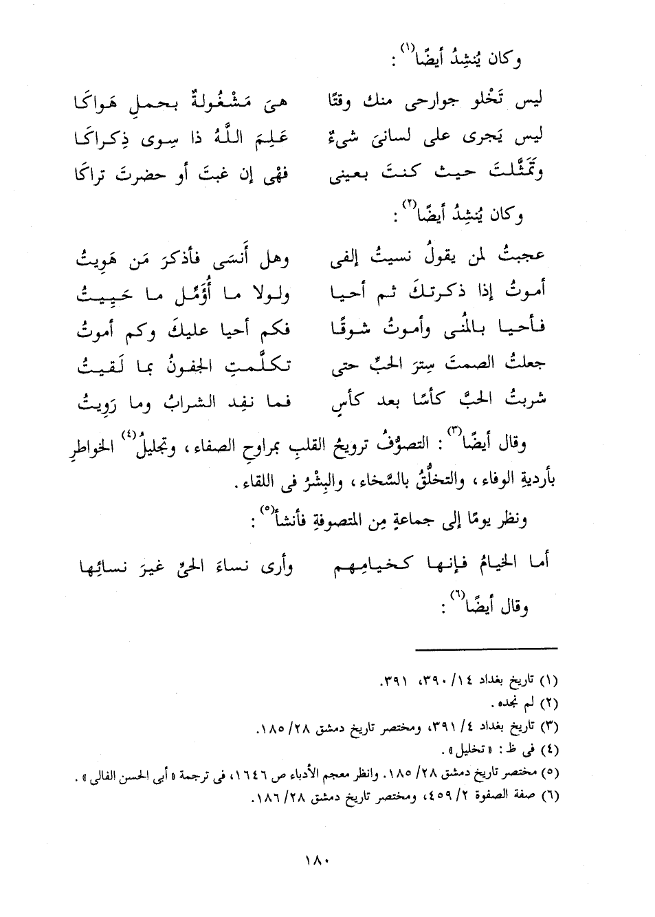 وَقَالَ أَيْضًا: التَّصَوُّفُ تَرْوِيحُ الْقَلْبِ بِمَرَاوِحِ الصَّفَاءِ، وَتَجْلِيلُ الْخَوَاطِرِ بِأَرْدِيَةِ الْوَفَاءِ، وَالتَّخَلُّقُ بِالسَّخَاءِ، وَالْبِشْرُ فِي اللِّقَاءِ.