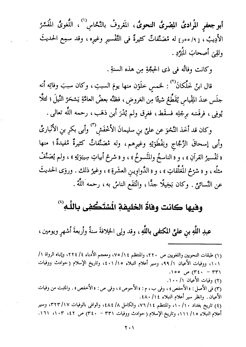 الْمَعْرُوفُ بِالنَّحَّاسِ، اللُّغَوِيِّ الْمُفَسِّرِ الْأَدِيبِ، لَهُ مُصَنَّفَاتٌ كَثِيرَةٌ فِي التَّفْسِيرِ وَغَيْرِهِ، وَقَدْ سَمِعَ الْحَدِيثَ وَلَقِيَ أَصْحَابَ الْمُبَرِّدِ وَكَانَتْ وَفَاتُهُ فِي ذِي الْحِجَّةِ مِنْ هَذِهِ السَّنَةِ.