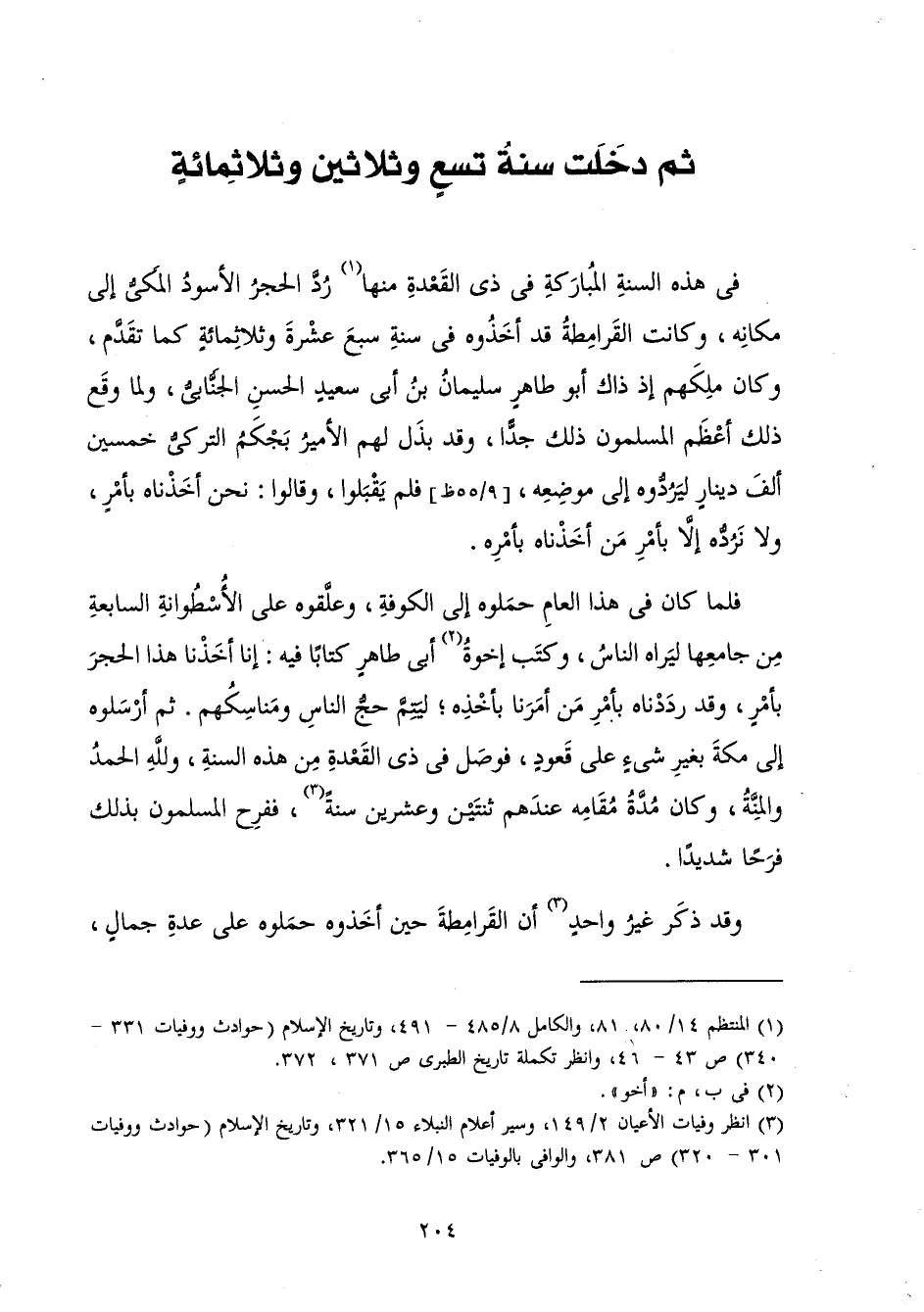 فِي هَذِهِ السَّنَةِ الْمُبَارَكَةِ فِي ذِي الْقَعْدَةِ مِنْهَا رُدَّ الْحَجَرُ الْأَسْوَدُ الْمَكِّيُّ إِلَى مَكَانِهِ، وَكَانَتِ الْقَرَامِطَةُ قَدْ أَخَذُوهُ فِي سَنَةِ سَبْعَ عَشْرَةَ وَثَلَاثِمِائَةٍ كَمَا تَقَدَّمَ، وَكَانَ مَلِكُهُمْ إِذْ ذَاكَ أَبُو طَاهِرٍ سُلَيْمَانُ بْنُ أَبِي سَعِيدٍ الْحَسَنُ الْجَنَّابِيُّ، وَلَمَّا وَقَعَ ذَلِكَ، أَعْظَمَ الْمُسْلِمُونَ ذَلِكَ جِدًّا، وَقَدْ بَذَلَ لَهُمُ الْأَمِيرُ بَجْكَمُ التُّرْكِيُّ خَمْسِينَ أَلْفَ دِينَارٍ ; لِيَرُدُّوهُ إِلَى مَوْضِعِهِ، فَلَمْ يَقْبَلُوا، وَقَالُوا: نَحْنُ أَخَذْنَاهُ بِأَمْرٍ، وَلَا نَرُدُّهُ إِلَّا بِأَمْرِ مَنْ أَخَذْنَاهُ بِأَمْرِهِ.