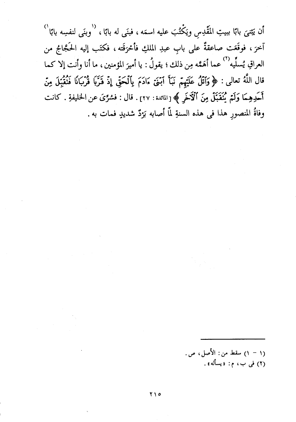 أَنْ يَبْنِيَ بَابًا بِبَيْتِ الْمَقْدِسِ وَيَكْتُبَ عَلَيْهِ اسْمَهُ، فَبَنَى لَهُ بَابًا، وَبَنَى لِنَفْسِهِ بَابًا آخَرَ، فَوَقَعَتْ صَاعِقَةٌ عَلَى بَابِ عَبْدِ الْمَلِكِ فَأَحْرَقَتْهُ، فَكَتَبَ إِلَيْهِ الْحَجَّاجُ مِنَ الْعِرَاقِ يُسَلِّيهِ عَمَّا أَهَمَّهُ مِنْ ذَلِكَ ; يَقُولُ: يَا أَمِيرَ الْمُؤْمِنِينَ، مَا أَنَا وَأَنْتَ إِلَّا كَمَا قَالَ اللَّهُ تَعَالَى: {وَاتْلُ عَلَيْهِمْ نَبَأَ ابْنَيْ آدَمَ بِالْحَقِّ إِذْ قَرَّبَا قُرْبَانًا فَتُقُبِّلَ مِنْ أَحَدِهِمَا وَلَمْ يُتَقَبَّلْ مِنَ الْآخَرِ} [المائدة: 27] قَالَ: فَسُرِّيَ عَنِ الْخَلِيفَةِ. كَانَتْ وَفَاةُ الْمَنْصُورِ هَذَا فِي هَذِهِ السَّنَةِ لَمَّا أَصَابَهُ بَرْدٌ شَدِيدٌ فَمَاتَ بِهِ.