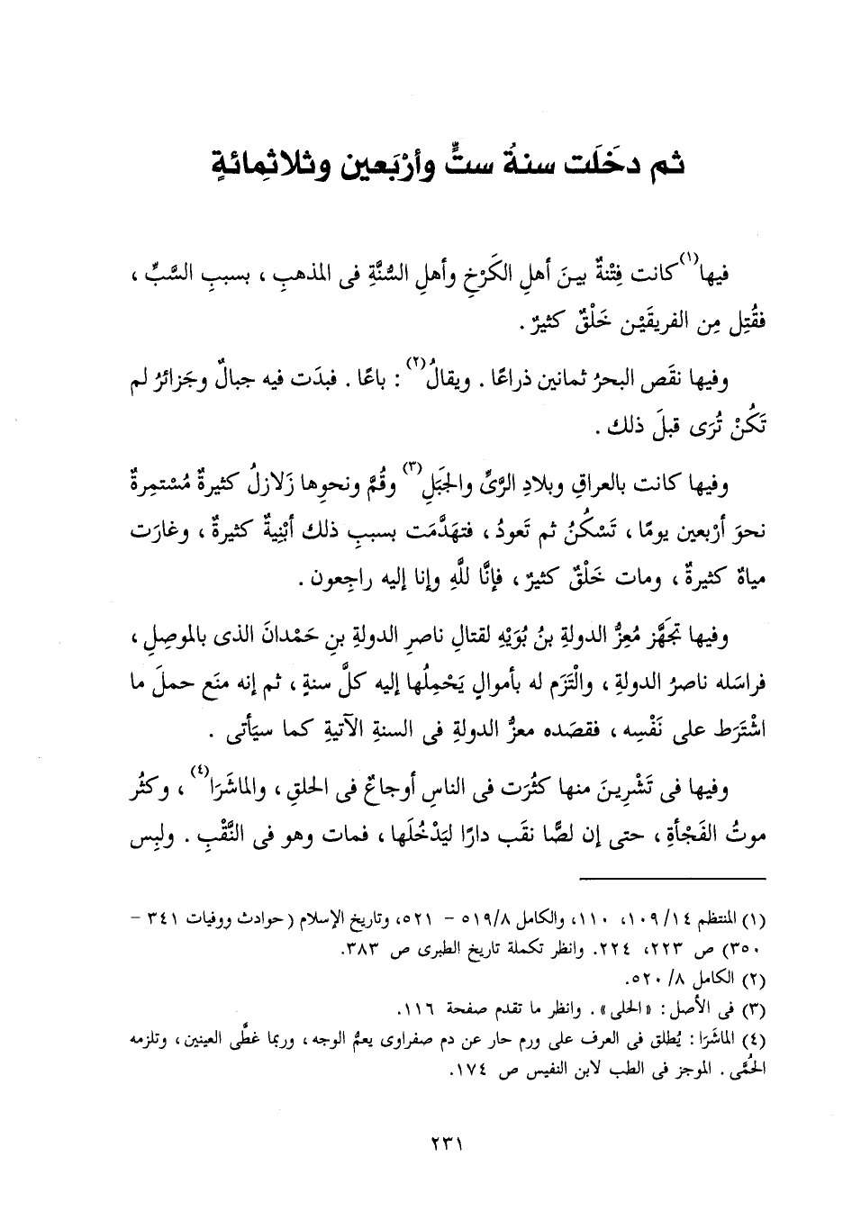 وَفِيهَا تَجَهَّزَ مُعِزُّ الدَّوْلَةِ بْنُ بُوَيْهِ لِقِتَالِ نَاصِرِ الدَّوْلَةِ بْنِ حَمْدَانَ الَّذِي بِالْمَوْصِلِ، فَرَاسَلَهُ نَاصِرُ الدَّوْلَةِ، وَالْتَزَمَ لَهُ بِأَمْوَالٍ يَحْمِلُهَا إِلَيْهِ كُلَّ سَنَةٍ، ثُمَّ إِنَّهُ مَنَعَ حَمْلَ مَا اشْتَرَطَ عَلَى نَفْسِهِ، فَقَصَدَهُ مُعِزُّ الدَّوْلَةِ فِي السَّنَةِ الْآتِيَةِ كَمَا سَيَأْتِي.
