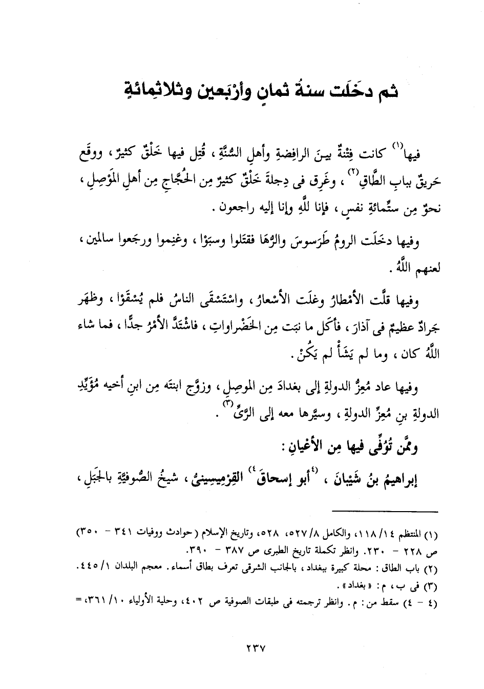 فِيهَا كَانَتْ فِتْنَةٌ بَيْنَ الرَّافِضَةِ وَأَهْلِ السُّنَّةِ، قُتِلَ فِيهَا خَلْقٌ كَثِيرٌ، وَوَقَعَ حَرِيقٌ بِبَابِ الطَّاقِ، وَغَرِقَ فِي دِجْلَةَ خَلْقٌ كَثِيرٌ مِنَ الْحُجَّاجِ مِنْ أَهْلِ الْمَوْصِلِ نَحْوٌ مِنْ سِتِّمِائَةِ نَفْسٍ، فَإِنَّا لِلَّهِ وَإِنَّا إِلَيْهِ رَاجِعُونَ.