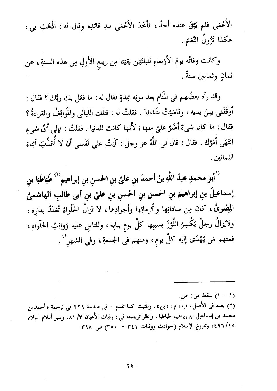 أَبُو مُحَمَّدٍ عَبْدُ اللَّهِ بْنُ أَحْمَدَ بْنِ عَلِيِّ بْنِ الْحَسَنِ بْنِ إِبْرَاهِيمَ طَبَاطَبَا بْنِ إِسْمَاعِيلَ بْنِ إِبْرَاهِيمَ بْنِ الْحَسَنِ بْنِ الْحَسَنِ بْنِ عَلِيِّ بْنِ أَبِي طَالِبٍ الْهَاشِمِيُّ الْمِصْرِيُّ، كَانَ مِنْ سَادَاتِهَا وَكُرَمَائِهَا وَأَجْوَادِهَا، لَا تَزَالُ الْحَلْوَاءُ تُعْقَدُ بِدَارِهِ، وَلَا يَزَالُ رَجُلٌ يَكْسِرُ اللَّوْزَ بِسَبَبِهَا كُلَّ يَوْمٍ بِبَابِهِ، وَلِلنَّاسِ عَلَيْهِ رَوَاتِبُ الْحَلْوَاءِ، فَمِنْهُمْ مَنْ يُهْدَى إِلَيْهِ كُلَّ يَوْمٍ، وَمِنْهُمْ فِي الْجُمُعَةِ، وَفِي الشَّهْرِ.