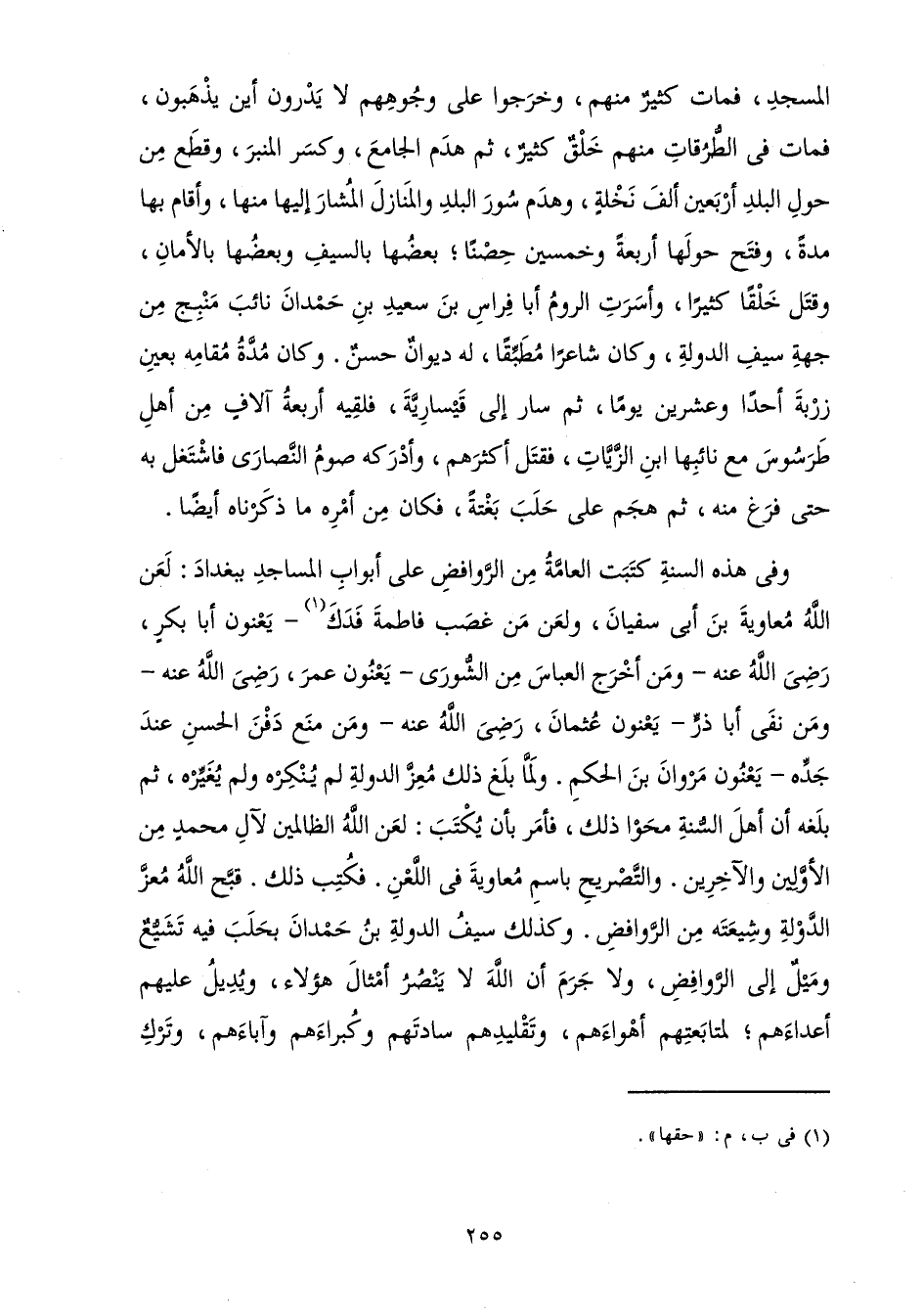 وَفِي هَذِهِ السَّنَةِ كَتَبَتِ الْعَامَّةُ مِنَ الرَّوَافِضِ عَلَى أَبْوَابِ الْمَسَاجِدِ بِبَغْدَادَ: لَعَنَ اللَّهُ مُعَاوِيَةَ بْنَ أَبِي سُفْيَانَ وَلَعَنَ مَنْ غَصَبَ فَاطِمَةَ فَدَكَ - يَعْنُونَ أَبَا بَكْرٍ رَضِيَ اللَّهُ عَنْهُ - وَمَنْ أَخْرَجَ الْعَبَّاسَ مِنَ الشُّورَى - يَعْنُونَ عُمَرَ، رَضِيَ اللَّهُ عَنْهُ - وَمَنْ نَفَى أَبَا ذَرٍّ - يَعْنُونَ عُثْمَانَ رَضِيَ اللَّهُ عَنْهُ - وَمَنْ مَنَعَ دَفْنَ الْحَسَنِ عِنْدَ جَدِّهِ - يَعْنُونَ مَرْوَانَ بْنَ الْحَكَمِ -، وَلَمَّا بَلَغَ ذَلِكَ مُعِزَّ الدَّوْلَةِ لَمْ يُنْكِرْهُ وَلَمْ يُغَيِّرْهُ، ثُمَّ بَلَغَهُ أَنَّ أَهْلَ السُّنَّةِ مَحَوْا ذَلِكَ، فَأَمَرَ بِأَنْ يُكْتَبَ: لَعَنَ اللَّهُ الظَّالِمِينَ لِآلِ مُحَمَّدٍ مِنَ الْأَوَّلِينَ وَالْآخَرِينَ، وَالتَّصْرِيحِ بِاسْمِ مُعَاوِيَةَ فِي اللَّعْنِ، فَكُتِبَ ذَلِكَ. قَبَّحَ اللَّهُ مُعِزَّ الدَّوْلَةِ وَشِيعَتَهُ مِنَ الرَّوَافِضِ، وَكَذَلِكَ سَيْفُ الدَّوْلَةِ بْنُ حَمْدَانَ بِحَلَبَ فِيهِ تَشَيُّعٌ وَمَيْلٌ إِلَى الرَّوَافِضِ، وَلَا جَرَمَ أَنَّ اللَّهَ لَا يَنْصُرُ أَمْثَالَ هَؤُلَاءِ، وَيُدِيلُ عَلَيْهِمْ أَعْدَاءَهُمْ ; لِمُتَابَعَتِهِمْ أَهْوَاءَهُمْ، وَتَقْلِيدِهِمْ سَادَتَهُمْ وَكُبَرَاءَهُمْ وَآبَاءَهُمْ، وَتَرْكِ