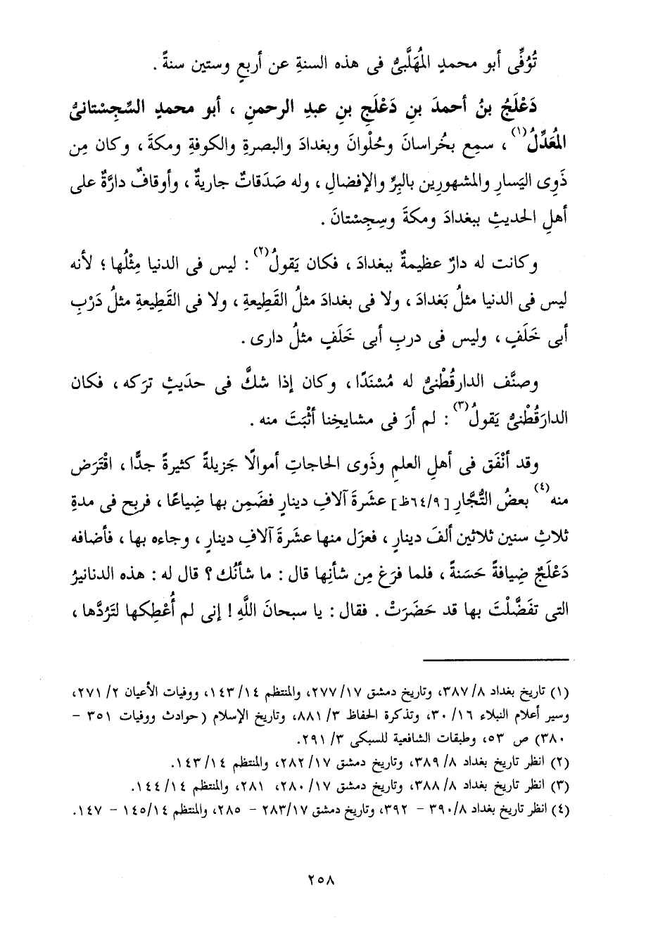 دَعْلَجُ بْنُ أَحْمَدَ بْنِ دَعْلَجَ بْنِ عَبْدِ الرَّحْمَنِ، أَبُو مُحَمَّدٍ السِّجِسْتَانِيُّ الْمُعَدِّلُ، سَمِعَ بِخُرَاسَانَ وَحُلْوَانَ وَبَغْدَادَ وَالْبَصْرَةِ وَالْكُوفَةِ وَمَكَّةَ، وَكَانَ مِنْ ذَوِي الْيَسَارِ وَالْمَشْهُورِينَ بِالْبِرِّ وَالْإِفْضَالِ، وَلَهُ صَدَقَاتٌ جَارِيَةٌ، وَأَوْقَافٌ دَارَّةٌ عَلَى أَهْلِ الْحَدِيثِ بِبَغْدَادَ وَمَكَّةَ وَسِجِسْتَانَ.