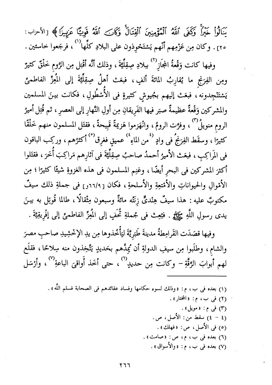 وَفِيهَا كَانَتْ وَقْعَةُ الْمَجَازِ بِبِلَادِ صِقِلِّيَّةَ وَذَلِكَ أَنَّهُ أَقْبَلَ مِنَ الرُّومِ خَلْقٌ كَثِيرٌ وَمِنَ الْفِرِنْجِ مَا يُقَارِبُ الْمِائَةَ أَلْفٍ، فَبَعَثَ أَهْلُ صِقِلِّيَّةَ إِلَى الْمُعِزِّ الْفَاطِمِيِّ يَسْتَنْجِدُونَهُ، فَبَعَثَ إِلَيْهِمْ بِجُيُوشٍ كَثِيرَةٍ فِي الْأُسْطُولِ، فَكَانَتْ بَيْنَ الْمُسْلِمِينَ وَالْمُشْرِكِينَ وَقْعَةٌ عَظِيمَةٌ صَبَرَ فِيهَا الْفَرِيقَانِ مِنْ أَوَّلِ النَّهَارِ إِلَى الْعَصْرِ، ثُمَّ قُتِلَ أَمِيرُ الرُّومِ مَنْوِيلُ وَفَّرَتِ الرُّومُ وَانْهَزَمُوا هَزِيمَةً قَبِيحَةً، فَقَتَلَ الْمُسْلِمُونَ مِنْهُمْ خَلْقًا كَثِيرًا، وَسَقَطَ الْفِرِنْجُ فِي وَادٍ مِنَ الْمَاءِ عَمِيقٍ فَغَرِقَ أَكْثَرُهُمْ، وَرَكِبَ الْبَاقُونَ فِي الْمَرَاكِبِ، فَبَعَثَ الْأَمِيرُ أَحْمَدُ صَاحِبُ صِقِلِّيَّةَ فِي آثَارِهِمْ مَرَاكِبَ أُخَرَ، فَقَتَلُوا أَكْثَرَ الْمُشْرِكِينَ فِي الْبَحْرِ أَيْضًا، وَغَنِمَ الْمُسْلِمُونَ فِي هَذِهِ الْغَزْوَةِ شَيْئًا كَثِيرًا، مِنَ الْأَمْوَالِ وَالْحَيَوَانَاتِ وَالْأَمْتِعَةِ وَالْأَسْلِحَةِ، فَكَانَ فِي جُمْلَةِ ذَلِكَ سَيْفٌ مَكْتُوبٌ عَلَيْهِ: هَذَا سَيْفٌ هِنْدِيٌّ زِنَتُهُ مِائَةٌ وَسَبْعُونَ مِثْقَالًا، طَالَمَا قُوتِلَ بِهِ بَيْنَ يَدَيْ رَسُولِ اللَّهِ صَلَّى اللَّهُ عَلَيْهِ وَسَلَّمَ، فَبُعِثَ فِي جُمْلَةِ تُحَفٍ إِلَى الْمُعِزِّ الْفَاطِمِيِّ إِلَى إِفْرِيقِيَّةَ.