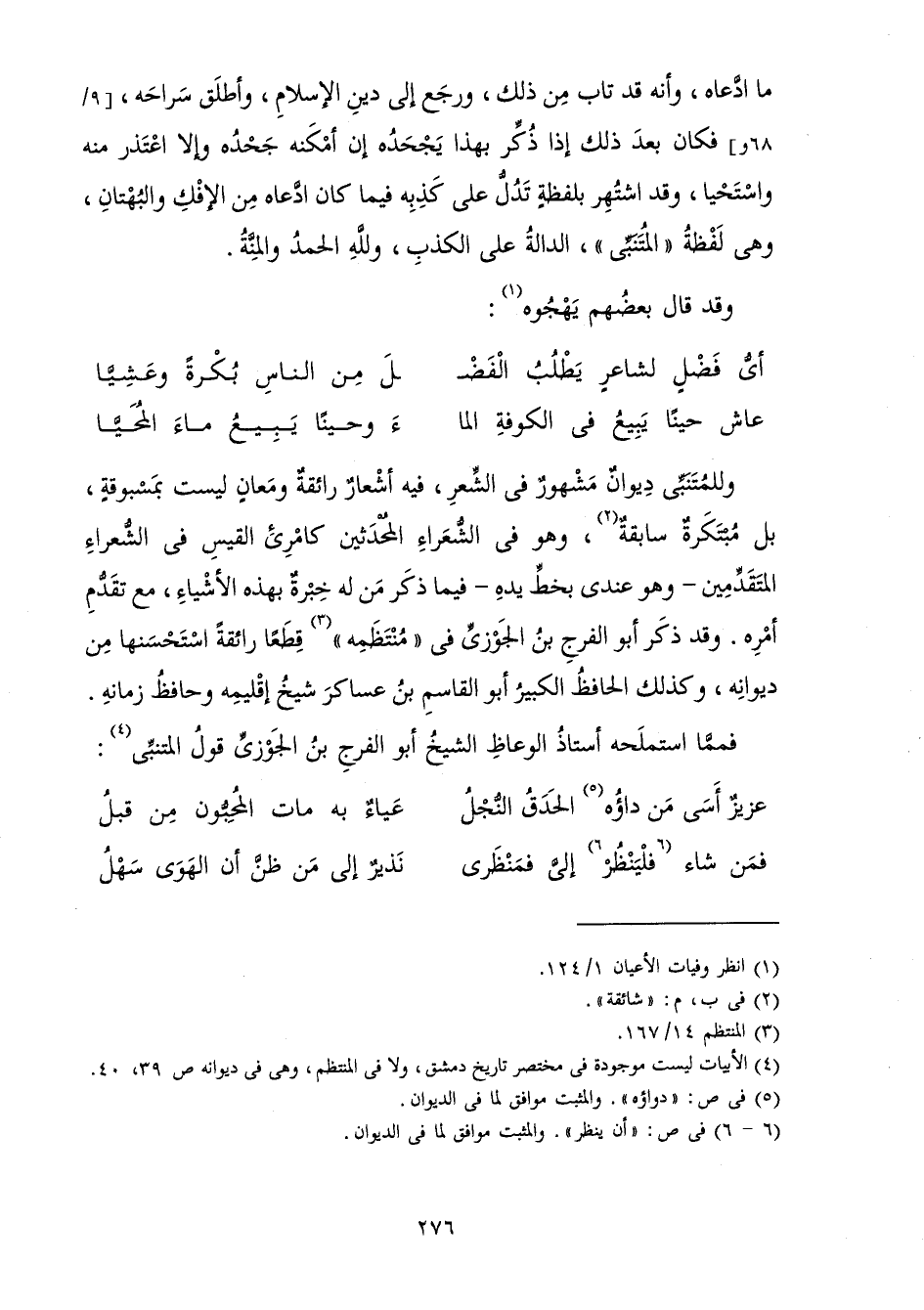 فَمِمَّا اسْتَمْلَحَهُ أُسْتَاذُ الْوُعَّاظِ الشَّيْخُ أَبُو الْفَرَجِ بْنُ الْجَوْزِيِّ قَوْلُ الْمُتَنَبِّي: