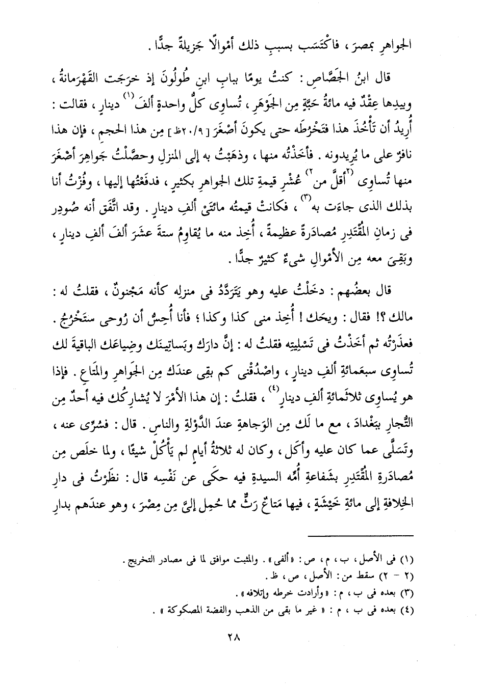 قَالَ بَعْضُهُمْ: دَخَلْتُ عَلَيْهِ وَهُوَ يَتَرَدَّدُ فِي مَنْزِلِهِ كَأَنَّهُ مَجْنُونٌ، فَقُلْتُ لَهُ: مَا لَكَ؟! فَقَالَ: وَيْحَكَ! أُخِذَ مِنِّي كَذَا وَكَذَا، فَأَنَا أُحِسُّ أَنَّ رُوحِي سَتَخْرُجُ. فَعَذَرْتُهُ ثُمَّ أَخَذْتُ فِي تَسْلِيَتِهِ فَقُلْتُ لَهُ: إِنَّ دَارَكَ وَبَسَاتِينَكَ وَضِيَاعَكَ الْبَاقِيَةَ لَكَ تُسَاوِي سَبْعَمِائَةِ أَلْفِ دِينَارٍ، وَاصْدُقْنِي كَمْ بَقِيَ عِنْدَكَ مِنَ الْجَوَاهِرِ وَالْمَتَاعِ، فَإِذَا هُوَ يُسَاوِي ثَلَاثَمِائَةِ أَلْفِ دِينَارٍ، فَقُلْتُ: إِنَّ هَذَا أَمْرٌ لَا يُشَارِكُكَ فِيهِ أَحَدٌ مِنَ التُّجَّارِ بِبَغْدَادَ، مَعَ مَا لَكَ مِنَ الْوَجَاهَةِ عِنْدَ الدَّوْلَةِ وَالنَّاسِ. قَالَ: فَسُرِّيَ عَنْهُ، وَتَسَلَّى عَمَّا كَانَ عَلَيْهِ وَأَكَلَ، وَكَانَ لَهُ ثَلَاثَةُ أَيَّامٍ لَمْ يَأْكُلْ شَيْئًا، وَلَمَّا خَلَصَ مِنْ مُصَادَرَةِ الْمُقْتَدِرِ بِشَفَاعَةِ أُمِّهِ السَّيِّدَةِ فِيهِ، حَكَى عَنْ نَفْسِهِ، قَالَ: نَظَرْتُ فِي دَارِ الْخِلَافَةِ إِلَى مِائَةِ خَيْشَةٍ، فِيهَا مَتَاعٌ رَثٌّ مِمَّا حُمِلَ إِلَيَّ مِنْ مِصْرَ، وَهُوَ عِنْدَهُمْ بِدَارِ