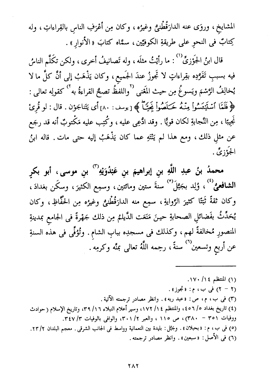 الْمَشَايِخِ، وَرَوَى عَنْهُ الدَّارَقُطْنِيُّ وَغَيْرُهُ، وَكَانَ مِنْ أَعْرَفِ النَّاسِ بِالْقِرَاءَاتِ، وَلَهُ كِتَابٌ فِي النَّحْوِ عَلَى طَرِيقَةِ الْكُوفِيِّينَ، سَمَّاهُ كِتَابَ " الْأَنْوَارِ ".