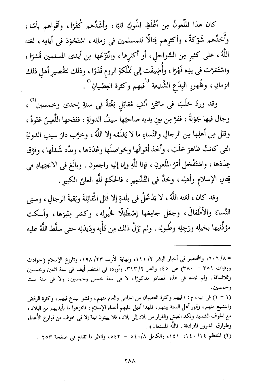 كَانَ هَذَا الْمَلْعُونُ مِنْ أَغْلَظِ الْمُلُوكِ قَلْبًا، وَأَشَدِّهِمْ كُفْرًا، وَأَقْوَاهُمْ بَأْسًا، وَأَحَدِّهِمْ شَوْكَةً، وَأَكْثَرِهِمْ قِتَالًا لِلْمُسْلِمِينَ فِي زَمَانِهِ، اسْتَحْوَذَ فِي أَيَّامِهِ - لَعَنَهُ اللَّهُ - عَلَى كَثِيرٍ مِنَ السَّوَاحِلِ، أَوْ أَكْثَرِهَا، وَانْتَزَعَهَا مِنْ أَيْدِي الْمُسْلِمِينَ قَسْرًا، وَاسْتَمَرَّتْ فِي يَدِهِ قَهْرًا، وَأُضِيفَتْ إِلَى مَمْلَكَةِ الرُّومِ قَدَرًا، وَذَلِكَ لِتَقْصِيرِ أَهْلِ ذَلِكَ الزَّمَانِ، وَظُهُورِ الْبِدَعِ الشَّنِيعَةِ فِيهِمْ وَكَثْرَةِ الْعِصْيَانِ.
