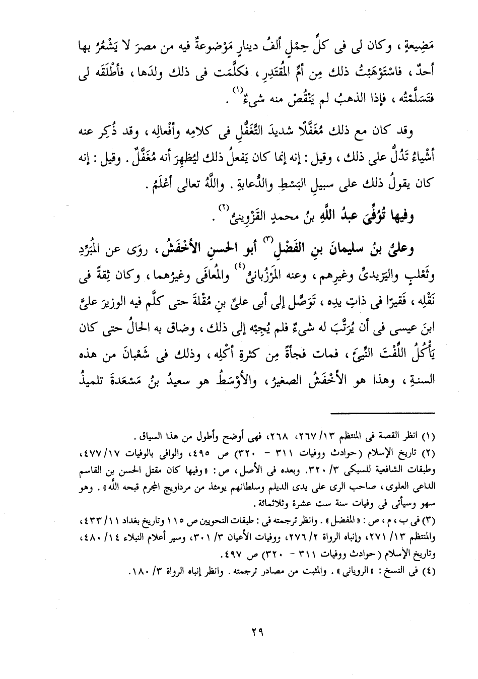 وَعَلِيُّ بْنُ سُلَيْمَانَ بْنِ الْفَضْلِ أَبُو الْحَسَنِ الْأَخْفَشُ، رَوَى عَنِ الْمُبَرِّدِ وَثَعْلَبٍ وَالْيَزِيدِيِّ وَغَيْرِهِمْ، وَعَنْهُ الْمَرْزُبَانِيُّ وَالْمُعَافَى وَغَيْرُهُمَا، وَكَانَ ثِقَةً فِي نَقْلِهِ فَقِيرًا فِي ذَاتِ يَدِهِ، تَوَصَّلَ إِلَى أَبِي عَلِيِّ بْنِ مُقْلَةَ حَتَّى كَلَّمَ فِيهِ الْوَزِيرَ عَلِيَّ بْنَ عِيسَى فِي أَنْ يُرَتَّبَ لَهُ شَيْءٌ، فَلَمْ يُجِبْهُ إِلَى ذَلِكَ، وَضَاقَ بِهِ الْحَالُ حَتَّى كَانَ يَأْكُلُ اللِّفْتَ النَّيِّئَ، فَمَاتَ فَجْأَةً مِنْ كَثْرَةِ أَكْلِهِ، وَذَلِكَ فِي شَعْبَانَ مِنْ هَذِهِ السَّنَةِ، وَهَذَا هُوَ الْأَخْفَشُ الصَّغِيرُ، وَالْأَوْسَطُ هُوَ سَعِيدُ بْنُ مَسْعَدَةَ تِلْمِيذُ