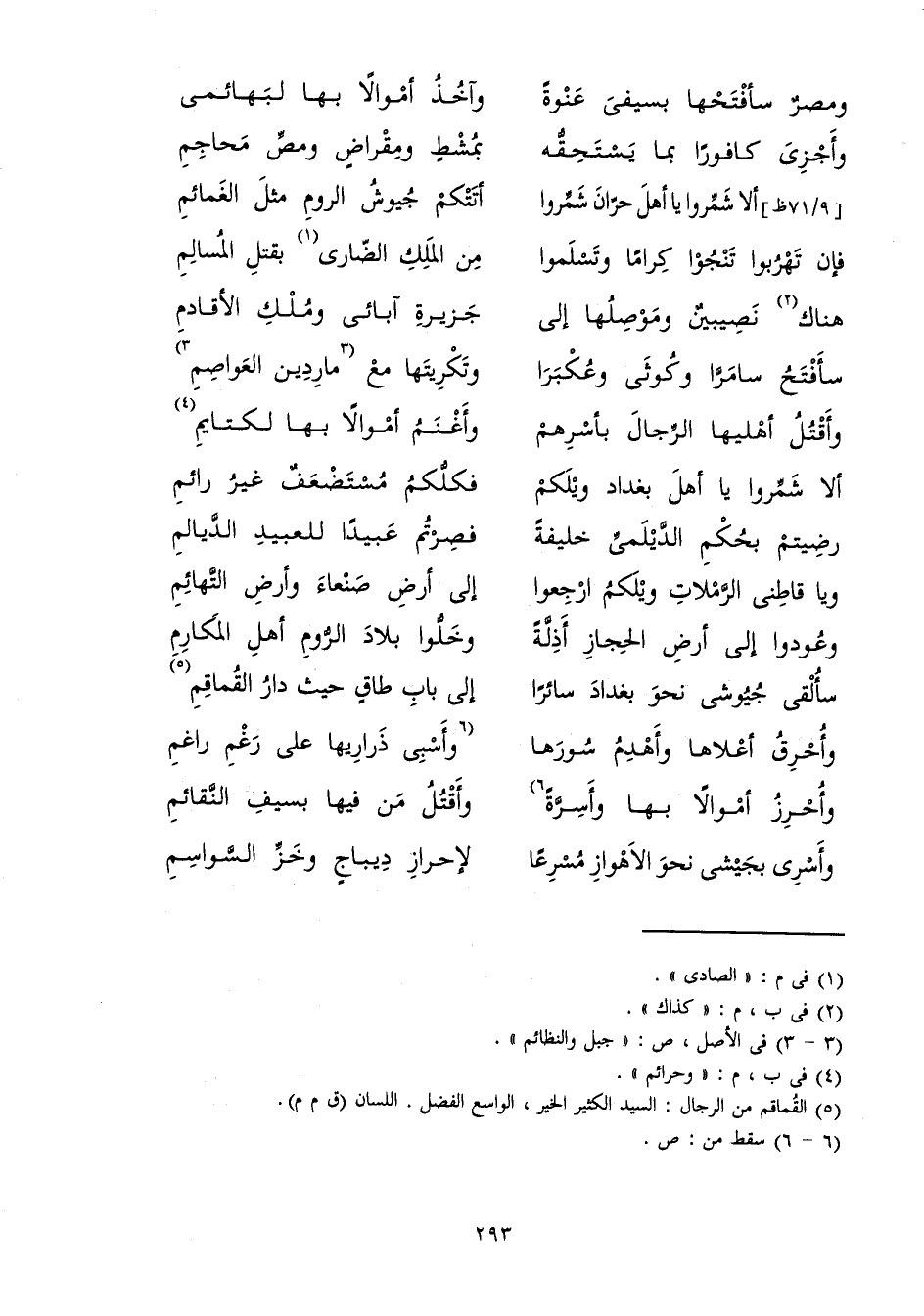 وَخَلُّوا بِلَادَ الرُّومِ أَهْلِ الْمَكَارِمِ ... سَأُلْقِي جُيُوشِي نَحْوَ بَغْدَادَ سَائِرًا