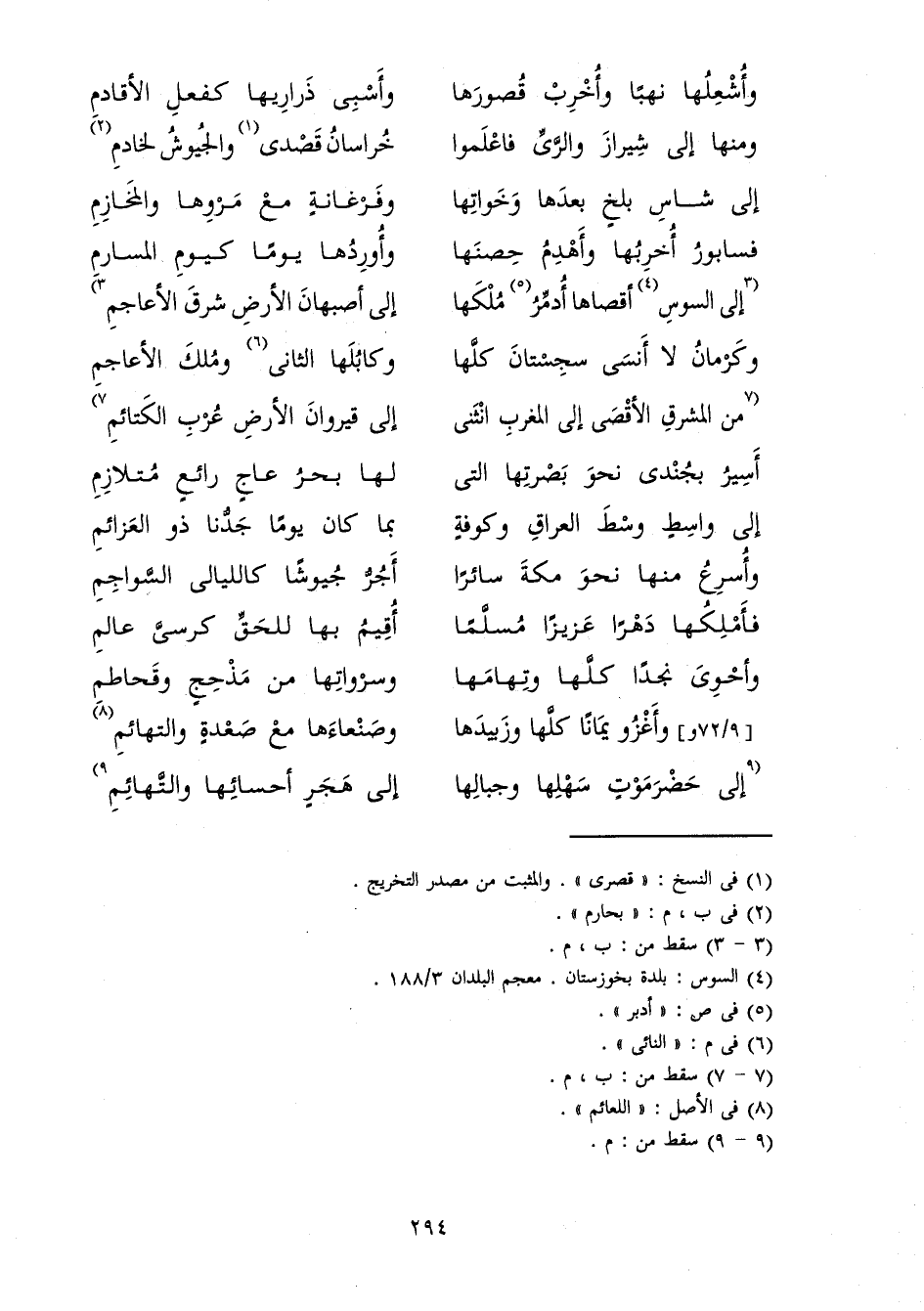 إِلَى أَصْبَهَانَ الْأَرْضِ شَرْقَ الْأَعَاجِمِ ... وَكَرْمَانُ لَا أَنْسَى سِجِسْتَانَ كُلَّهَا