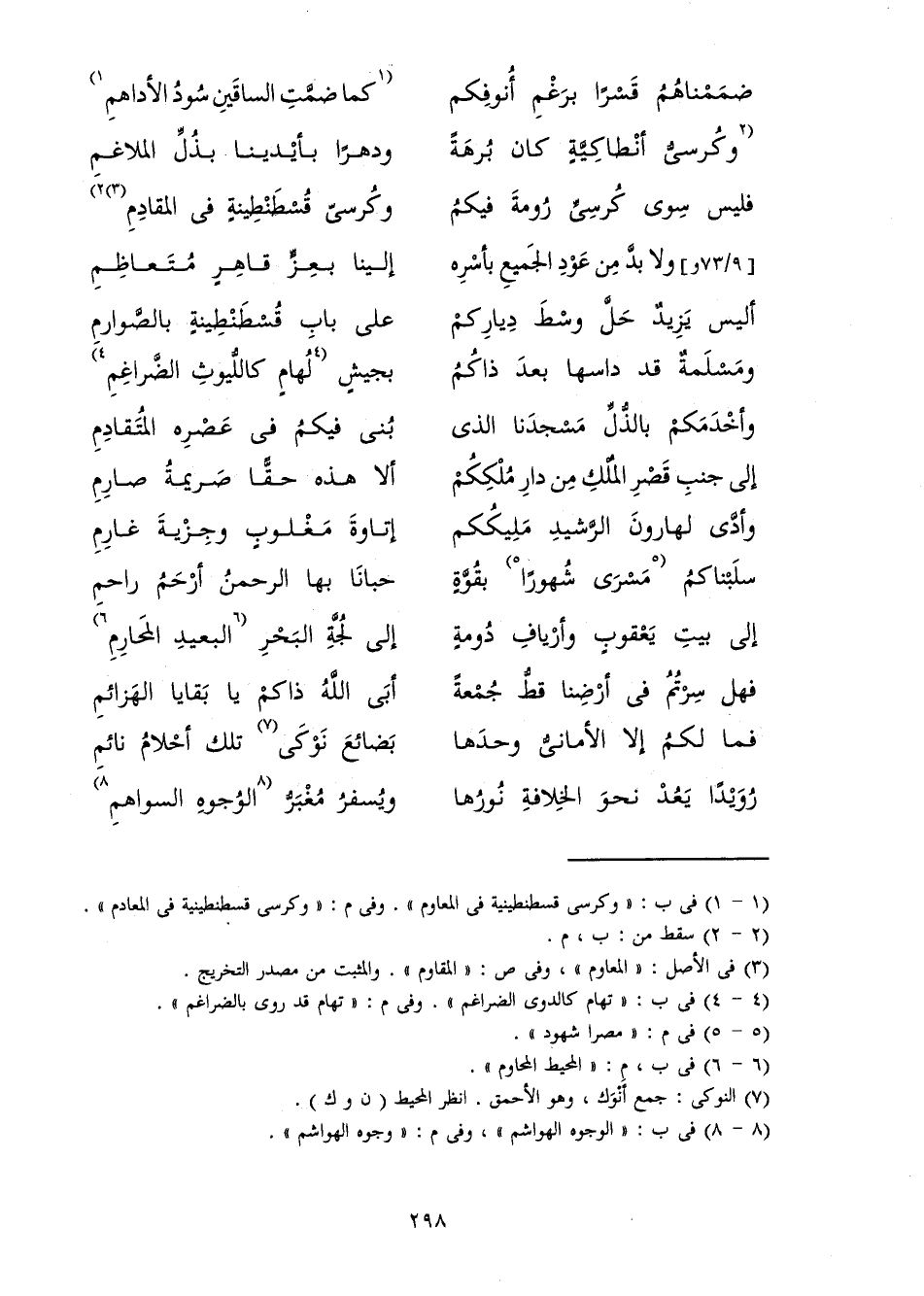 فَلَيْسَ سِوَى كُرْسِيِّ رُومَةَ فِيكُمُ ... وَكُرْسِيِّ قُسْطَنْطِينَةٍ فِي الْمَقَادِمِ
