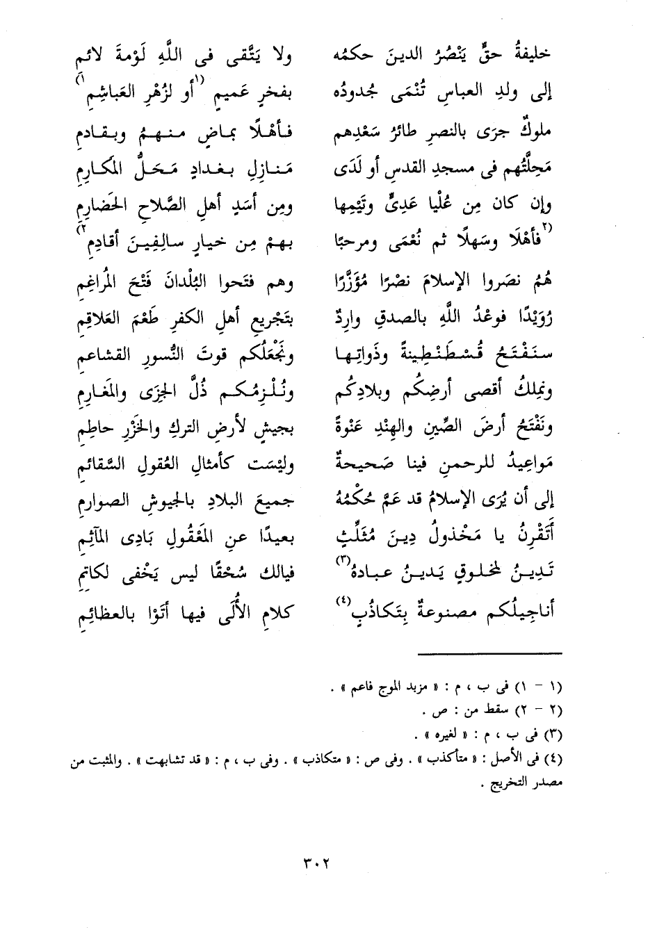 جَمِيعَ الْبِلَادِ بِالْجُيُوشِ الصَّوَارِمِ ... أَتَقْرِنُ يَا مَخْذُولُ دِينَ مُثَلِّثٍ