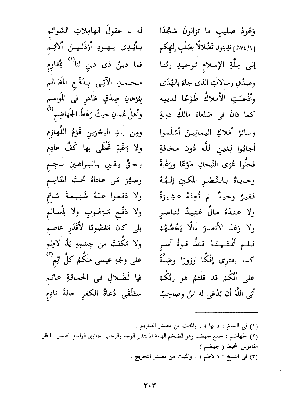 إِلَى مِلَّةِ الْإِسْلَامِ تَوْحِيدِ رَبِّنَا. ... فَمَا دِينُ ذِي دِينٍ لَنَا بِمُقَاوِمِ