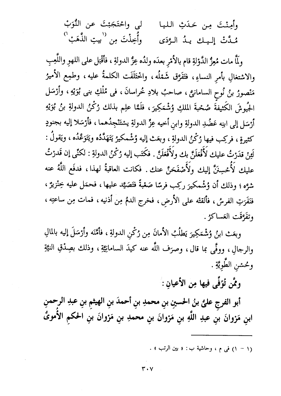 وَلَمَّا مَاتَ مُعِزُّ الدَّوْلَةِ قَامَ بِالْأَمْرِ بَعْدَهُ وَلَدُهُ عِزُّ الدَّوْلَةِ، فَأَقْبَلَ عَلَى اللَّهْوِ وَاللَّعِبِ وَالِاشْتِغَالِ بِأَمْرِ النِّسَاءِ، فَتَفَرَّقَ شَمْلُهُ، وَاخْتَلَفَتِ الْكَلِمَةُ عَلَيْهِ، وَطَمِعَ الْأَمِيرُ مَنْصُورُ بْنُ نُوحٍ السَّامَانِيُّ صَاحِبُ بِلَادِ خُرَاسَانَ فِي مُلْكِ بَنِي بُوَيْهِ، وَأَرْسَلَ الْجُيُوشَ الْكَثِيفَةَ صُحْبَةَ الْمَلِكِ وُشْمَكِيرَ، فَلَمَّا عَلِمَ بِذَلِكَ رُكْنُ الدَّوْلَةِ بْنُ بُوَيْهِ أَرْسَلَ إِلَى ابْنِهِ عَضُدِ الدَّوْلَةِ وَابْنِ أَخِيهِ عِزِّ الدَّوْلَةِ يَسْتَنْجِدُهُمَا، فَأَرْسَلَا إِلَيْهِ بِجُنُودٍ كَثِيرَةٍ، فَرَكِبَ فِيهَا رُكْنُ الدَّوْلَةِ، وَبَعَثَ إِلَيْهِ وُشْمَكِيرُ يَتَهَدَّدُهُ وَيَتَوَعَّدُهُ، وَيَقُولُ: لَئِنْ قَدَرْتُ عَلَيْكَ لَأَفْعَلَنَّ بِكَ وَلَأَفْعَلَنَّ. فَكَتَبَ إِلَيْهِ رُكْنُ الدَّوْلَةِ: لَكِنِّي إِنْ قَدَرْتُ عَلَيْكَ لَأُحْسِنَنَّ إِلَيْكَ وَلَأَصْفَحَنَّ عَنْكَ. فَكَانَتِ الْعَاقِبَةُ لِهَذَا، فَدَفَعَ اللَّهُ عَنْهُ شَرَّهُ ; وَذَلِكَ أَنَّ وُشْمَكِيرَ رَكِبَ فَرَسًا صَعْبَةً فَتَصَيَّدَ عَلَيْهَا، فَحَمَلَ عَلَيْهِ خِنْزِيرٌ، فَنَفَرَتِ الْفَرَسُ، فَأَلْقَتْهُ عَلَى الْأَرْضِ، فَخَرَجَ الدَّمُ مِنْ أُذُنَيْهِ، فَمَاتَ مِنْ سَاعَتِهِ، وَتَفَرَّقَتِ الْعَسَاكِرُ.