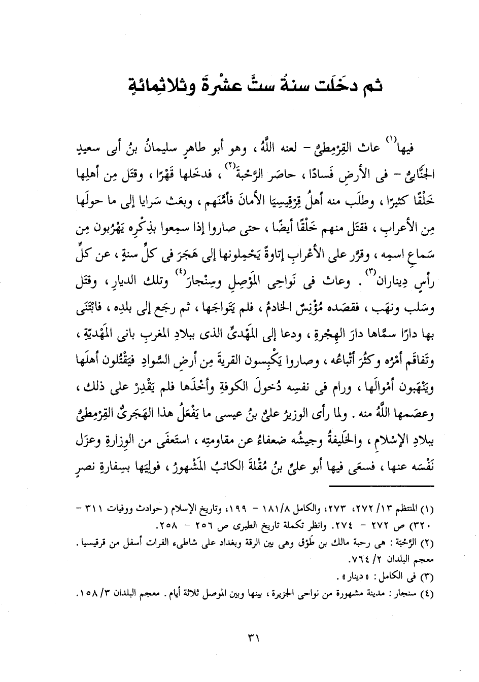 فِيهَا عَاثَ الْقِرْمِطِيُّ - لَعَنَهُ اللَّهُ، وَهُوَ أَبُو طَاهِرٍ سُلَيْمَانُ بْنُ أَبِي سَعِيدٍ الْجَنَّابِيُّ - فِي الْأَرْضِ فَسَادًا، حَاصَرَ الرَّحْبَةَ، فَدَخَلَهَا قَهْرًا، وَقَتَلَ مِنْ أَهْلِهَا خَلْقًا كَثِيرًا، وَطَلَبَ مِنْهُ أَهْلُ قِرْقِيسِيَا الْأَمَانَ فَأَمَّنَهُمْ، وَبَعَثَ سَرَايَا إِلَى مَا حَوْلَهَا مِنَ الْأَعْرَابِ، فَقَتَلَ مِنْهُمْ خَلْقًا أَيْضًا، حَتَّى صَارَ النَّاسُ إِذَا سَمِعُوا بِذِكْرِهِ يَهْرُبُونَ مِنْ سَمَاعِ اسْمِهِ، وَقَرَّرَ عَلَى الْأَعْرَابِ إِتَاوَةً يَحْمِلُونَهَا إِلَى هَجَرَ فِي كُلِّ سَنَةٍ، عَنْ كُلِّ رَأْسٍ دِينَارَانِ، وَعَاثَ فِي نُوَاحِي الْمَوْصِلِ وَسِنْجَارَ وَتِلْكَ الدِّيَارِ، وَقَتَلَ وَسَلَبَ وَنَهَبَ، فَقَصَدَهُ مُؤْنِسٌ الْخَادِمُ فَلَمْ يَتَوَاجَهَا، ثُمَّ رَجَعَ إِلَى بَلَدِهِ فَابْتَنَى بِهَا دَارًا سَمَّاهَا دَارَ الْهِجْرَةِ، وَدَعَا إِلَى الْمَهْدِيِّ الَّذِي بِبِلَادِ الْمَغْرِبِ بَانِي الْمَهْدِيَّةِ وَتَفَاقَمَ أَمَرُهُ، وَكَثُرَ أَتْبَاعُهُ، وَصَارُوا يَكْبِسُونَ الْقَرْيَةَ مِنْ أَرْضِ السَّوَادِ، فَيَقْتُلُونَ أَهْلَهَا، وَيَنْهَبُونَ أَمْوَالَهَا، وَرَامَ فِي نَفْسِهِ دُخُولَ الْكُوفَةِ وَأَخْذَهَا، فَلَمْ يَقْدِرْ عَلَى ذَلِكَ وَعَصَمَهَا اللَّهُ مِنْهُ. وَلَمَّا رَأَى الْوَزِيرُ عَلِيُّ بْنُ عِيسَى مَا يَفْعَلُ هَذَا الْهَجَرِيُّ الْقِرْمِطِيُّ بِبِلَادِ الْإِسْلَامِ، وَالْخَلِيفَةُ وَجَيْشُهُ ضُعَفَاءُ عَنْ مُقَاوَمَتِهِ، اسْتَعْفَى مِنَ الْوِزَارَةِ وَعَزَلَ نَفْسَهُ عَنْهَا، فَسَعَى فِيهَا أَبُو عَلِيِّ بْنُ مُقْلَةَ الْكَاتِبُ الْمَشْهُورُ، فَوَلِيَهَا بِسِفَارَةِ نَصْرٍ