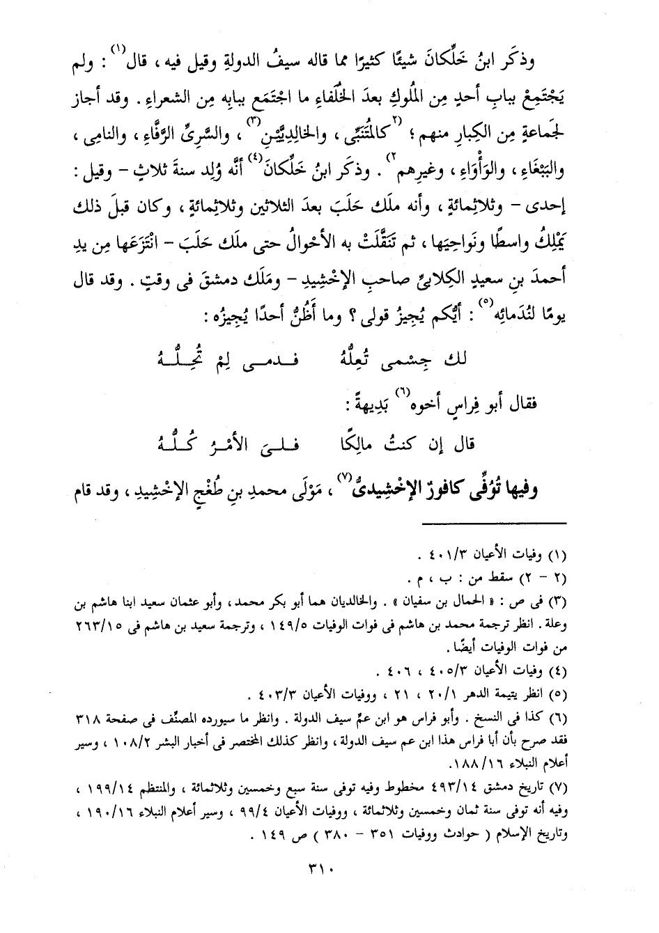وَذَكَرَ ابْنُ خِلِّكَانَ شَيْئًا كَثِيرًا مِمَّا قَالَهُ سَيْفُ الدَّوْلَةِ وَقِيلَ فِيهِ، قَالَ: وَلَمْ يَجْتَمِعْ بِبَابِ أَحَدٍ مِنَ الْمُلُوكِ بَعْدَ الْخُلَفَاءِ مَا اجْتَمَعَ بِبَابِهِ مِنَ الشُّعَرَاءِ. وَقَدْ أَجَازَ لِجَمَاعَةٍ مِنَ الْكِبَارِ مِنْهُمْ ; كَالْمُتَنَبِّي وَالْخَالِدِيَّيْنِ، وَالسَّرِيِّ الرَّفَّاءِ، وَالنَّامِي، وَالْبَبْغَاءِ، وَالْوَأْوَاءِ، وَغَيْرِهِمْ. وَذَكَرَ ابْنُ خِلِّكَانَ أَنَّهُ وُلِدَ سَنَةَ ثَلَاثٍ - وَقِيلَ: إِحْدَى - وَثَلَاثِمِائَةٍ، وَأَنَّهُ مَلَكَ حَلَبَ بَعْدَ الثَّلَاثِينَ وَثَلَاثِمِائَةٍ، وَكَانَ قَبْلَ ذَلِكَ يَمْلِكُ وَاسِطًا وَنَوَاحِيهَا، ثُمَّ تَنَقَّلَتْ بِهِ الْأَحْوَالُ حَتَّى مَلَكَ حَلَبَ - انْتَزَعَهَا مِنْ يَدِ أَحْمَدَ بْنِ سَعِيدٍ الْكِلَابِيِّ صَاحِبِ الْإِخْشِيدِ - وَمَلَكَ دِمَشْقَ فِي وَقْتٍ. وَقَدْ قَالَ يَوْمًا لِنُدَمَائِهِ: أَيُّكُمْ يُجِيزُ قَوْلِي، وَمَا أَظُنُّ أَحَدًا مِنْكُمْ يُجِيزُهُ:
