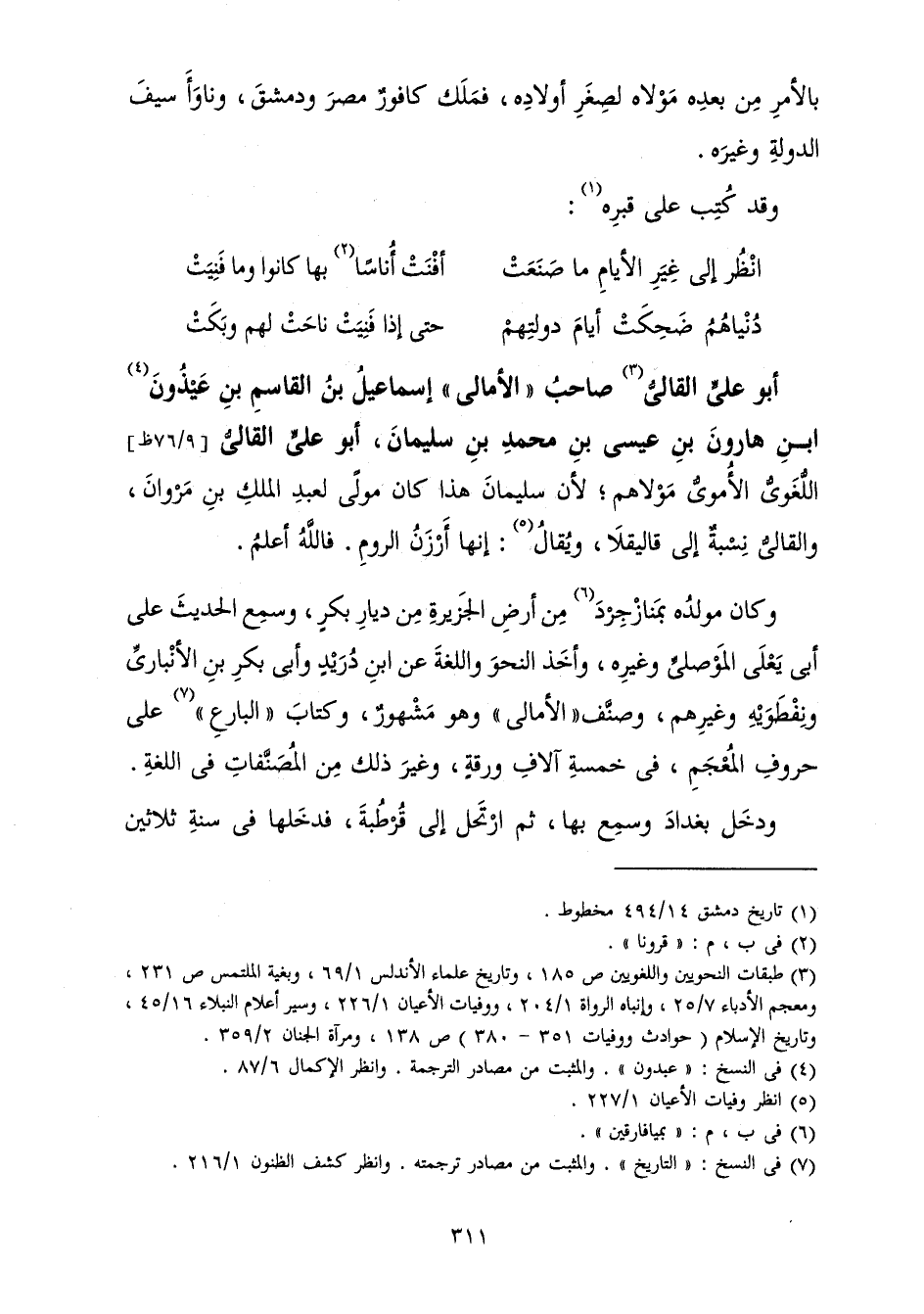 اللُّغَوِيُّ الْأُمَوِيُّ مَوْلَاهُمْ ; لِأَنَّ سُلَيْمَانَ هَذَا كَانَ مَوْلًى لِعَبْدِ الْمَلِكِ بْنِ مَرْوَانَ، وَالْقَالِيُّ نِسْبَةٌ إِلَى قَالِيقِلَا وَيُقَالُ: إِنَّهَا أَرْزَنُ الرُّومِ، فَاللَّهُ أَعْلَمُ.