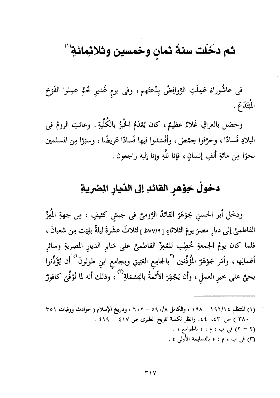 وَدَخَلَ أَبُو الْحَسَنِ جَوْهَرٌ الْقَائِدُ الرُّومِيُّ فِي جَيْشٍ كَثِيفٍ، مِنْ جِهَةِ الْمُعِزِّ الْفَاطِمِيِّ إِلَى دِيَارِ مِصْرَ يَوْمَ الثُّلَاثَاءِ لِثَلَاثَ عَشْرَةَ لَيْلَةً بَقِيَتْ مِنْ شَعْبَانَ، فَلَمَّا كَانَ يَوْمَ الْجُمُعَةِ خُطِبَ لِلْمُعِزِّ الْفَاطِمِيِّ عَلَى مَنَابِرِ الدِّيَارِ الْمِصْرِيَّةِ وَسَائِرِ أَعْمَالِهَا، وَأَمَرَ جَوْهَرٌ الْمُؤَذِّنِينَ بِالْجَامِعِ الْعَتِيقِ وَبِجَامِعِ ابْنِ طُولُونَ أَنْ يُؤَذِّنُوا بِحَيَّ عَلَى خَيْرِ الْعَمَلِ، وَأَنْ يَجْهَرَ الْأَئِمَّةُ بِالْبَسْمَلَةِ، وَذَلِكَ أَنَّهُ لَمَّا تُوُفِّيَ كَافُورٌ