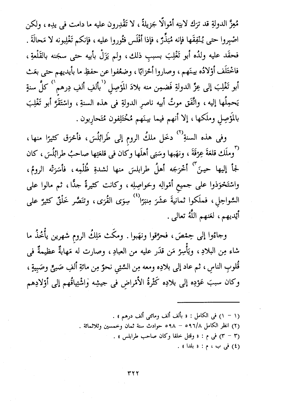 وَفِي هَذِهِ السَّنَةِ دَخَلَ مَلِكُ الرُّومِ إِلَى طَرَابُلُسَ فَأَحْرَقَ كَثِيرًا مِنْهَا، وَمَلَكَ قَلْعَةَ عِرْقَةَ وَنَهَبَهَا وَسَبَى أَهْلَهَا وَكَانَ فِي قَلْعَتِهَا صَاحِبُ طَرَابُلُسَ كَانَ لَجَأَ إِلَيْهَا حِينَ أَخْرَجَهُ أَهْلُ طَرَابُلُسَ مِنْهَا لِشِدَّةِ ظُلْمِهِ، فَأَسَرَتْهُ الرُّومُ، وَاسْتَحْوَذُوا عَلَى جَمِيعِ أَمْوَالِهِ وَحَوَاصِلِهِ، وَكَانَتْ كَثِيرَةً جِدًّا، ثُمَّ مَالُوا عَلَى السَّوَاحِلِ، فَمَلَكُوا ثَمَانِيَةَ عَشَرَ مِنْبَرًا سِوَى الْقُرَى، وَتَنَصَّرَ خَلْقٌ كَثِيرٌ عَلَى أَيْدِيهِمْ، لَعَنَهُمُ اللَّهُ تَعَالَى.