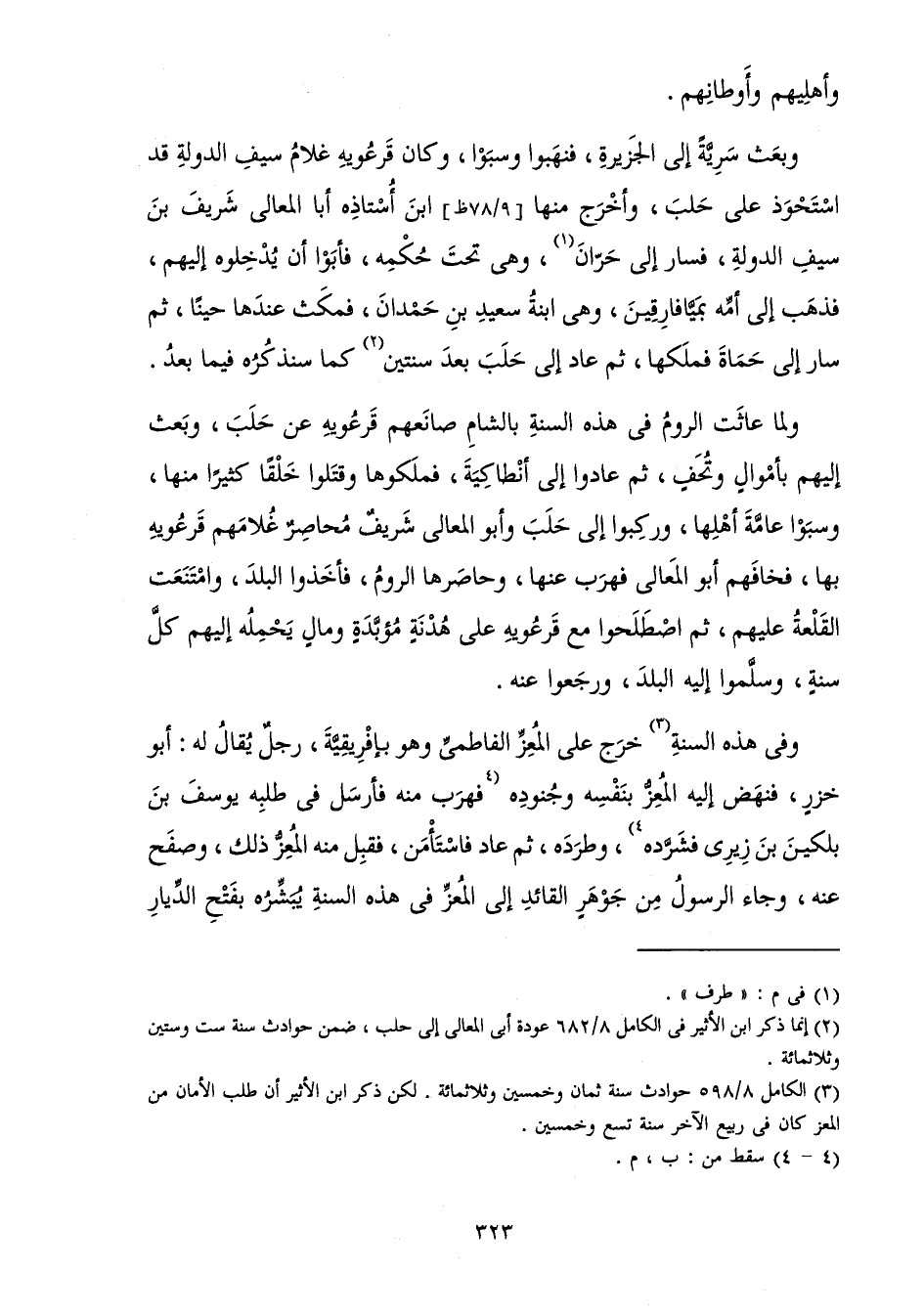 وَبَعَثَ سَرِيَّةً إِلَى الْجَزِيرَةِ فَنَهَبُوا وَسَبَوْا، وَكَانَ قَرْعُوَيْهِ غُلَامُ سَيْفِ الدَّوْلَةِ قَدِ اسْتَحْوَذَ عَلَى حَلَبَ وَأَخْرَجَ مِنْهَا ابْنَ أُسْتَاذِهِ أَبَا الْمَعَالِي شَرِيفَ بْنَ سَيْفِ الدَّوْلَةِ، فَسَارَ إِلَى حُرَّانَ وَهِيَ تَحْتَ حُكْمِهِ، فَأَبَوْا أَنْ يُدْخِلُوهُ إِلَيْهِمْ، فَذَهَبَ إِلَى أُمِّهِ بِمَيَّافَارِقِينَ، وَهِيَ ابْنَةُ سَعِيدِ بْنِ حَمْدَانَ، فَمَكَثَ عِنْدَهَا حِينًا، ثُمَّ سَارَ إِلَى حُمَاةَ فَمَلَكَهَا، ثُمَّ عَادَ إِلَى حَلَبَ بَعْدَ سَنَتَيْنِ كَمَا سَنَذْكُرُهُ فِيمَا بَعْدُ.