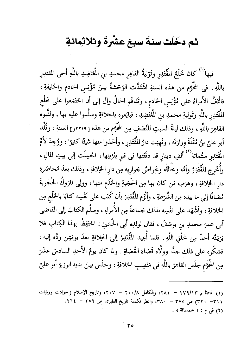 فِيهَا كَانَ خَلْعُ الْمُقْتَدِرِ وَتَوْلِيَةُ الْقَاهِرِ مُحَمَّدِ بْنِ الْمُعْتَضِدِ بِاللَّهِ أَخِي الْمُقْتَدِرِ بِاللَّهِ.