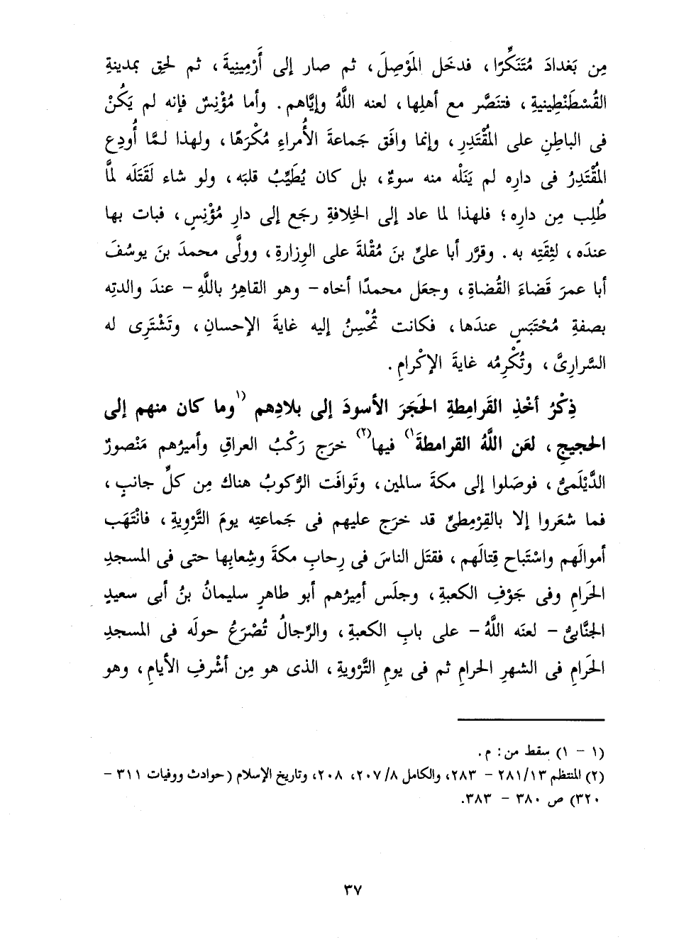 ذِكْرُ أَخْذِ الْقَرَامِطَةِ الْحَجَرَ الْأَسْوَدَ إِلَى بِلَادِهِمْ، وَمَا كَانَ مِنْهُمْ إِلَى الْحَجِيجِ، لَعَنَ اللَّهُ الْقَرَامِطَةَ