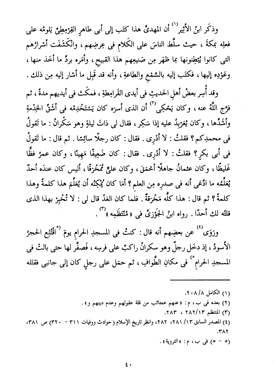 وَقَدْ أُسِرَ بَعْضُ أَهْلِ الْحَدِيثِ فِي أَيْدِي الْقَرَامِطَةِ، فَمَكَثَ فِي أَيْدِيهِمْ مُدَّةً، ثُمَّ فَرَّجَ اللَّهُ عَنْهُ، وَكَانَ يَحْكِي أَنَّ الَّذِي أَسَرَهُ كَانَ يَسْتَخْدِمُهُ فِي أَشَقِّ الْخِدْمَةِ وَأَشَدِّهَا، وَكَانَ يُعَرْبِدُ عَلَيْهِ إِذَا سَكِرَ، فَقَالَ لِي ذَاتَ لَيْلَةٍ وَهُوَ سَكْرَانُ: مَا تَقَولُ فِي مُحَمَّدِكُمْ؟ فَقُلْتُ: لَا أَدْرِي. فَقَالَ: كَانَ رَجُلًا سَائِسًا. ثُمَّ قَالَ: مَا تَقَولُ فِي أَبِي بَكْرٍ؟ فَقُلْتُ: لَا أَدْرِي، فَقَالَ: كَانَ ضَعِيفًا مَهِينًا، وَكَانَ عُمَرُ فَظًّا غَلِيظًا، وَكَانَ عُثْمَانُ جَاهِلًا أَحْمَقَ، وَكَانَ عَلِيٌّ مُمَخْرَقًا، أَلَيْسَ كَانَ عِنْدَهُ أَحَدٌ يُعَلِّمُهُ مَا ادَّعَى أَنَّهُ فِي صَدْرِهِ مِنَ الْعِلْمِ؟ أَمَا كَانَ يُمْكِنُهُ أَنْ يُعَلِّمَ هَذَا كَلِمَةً وَهَذَا كَلِمَةً؟ ثُمَّ قَالَ: هَذَا كُلُّهُ مَخْرَقَةٌ. فَلَمَّا كَانَ الْغَدُ، قَالَ لِي: لَا تُخْبِرْ بِهَذَا الَّذِي قُلْتُهُ لَكَ أَحَدًا. رَوَاهُ ابْنُ الْجَوْزِيِّ فِي " مُنْتَظَمِهِ ".