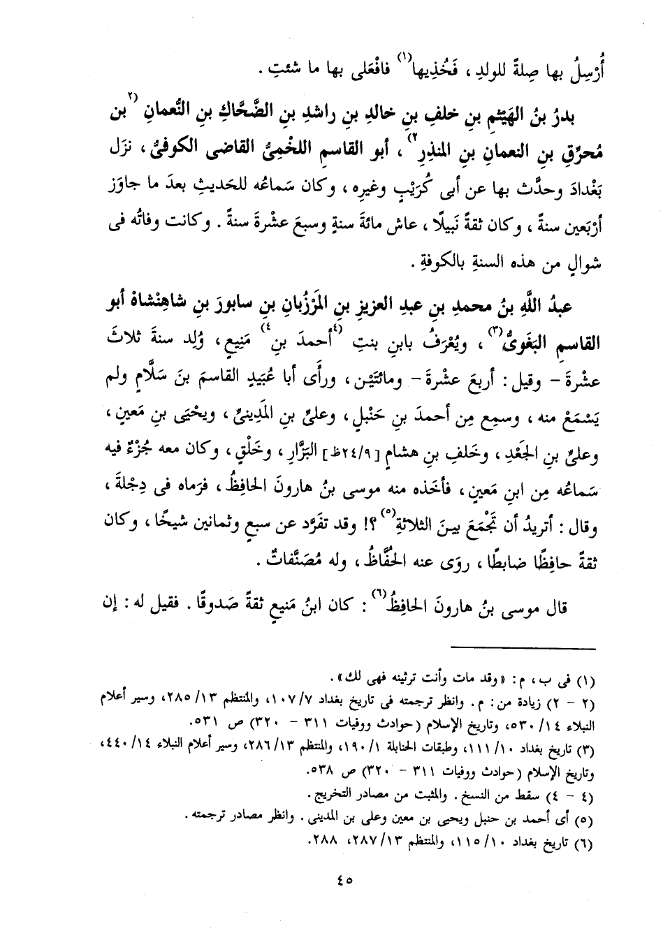 وَيُعْرَفُ بِابْنِ بِنْتِ أَحْمَدَ بْنِ مَنِيعٍ، وُلِدَ سَنَةَ ثَلَاثَ عَشْرَةَ - وَقِيلَ: أَرْبَعَ عَشْرَةَ - وَمِائَتَيْنِ، وَرَأَى أَبَا عُبَيْدٍ الْقَاسِمَ بْنَ سَلَّامٍ، وَلَمْ يَسْمَعْ مِنْهُ، وَسَمِعَ مِنْ أَحْمَدَ بْنِ حَنْبَلٍ، وَعَلِيِّ بْنِ الْمَدِينِيِّ، وَيَحْيَى بْنِ مَعِينٍ، وَعَلِيِّ بْنِ الْجَعْدِ، وَخَلَفِ بْنِ هِشَامٍ الْبَزَّارِ، وَخَلْقٍ، وَكَانَ مَعَهُ جُزْءٌ فِيهِ سَمَاعُهُ مِنَ ابْنِ مَعِينٍ، فَأَخَذَهُ مِنْهُ مُوسَى بْنُ هَارُونَ الْحَافِظُ، فَرَمَاهُ فِي دِجْلَةَ، وَقَالَ: أَتُرِيدُ أَنْ تَجْمَعَ بَيْنَ الثَّلَاثَةِ؟! وَقَدْ تَفَرَّدَ عَنْ سَبْعٍ وَثَمَانِينَ شَيْخًا، وَكَانَ ثِقَةً حَافِظًا ضَابِطًا، رَوَى عَنِ الْحُفَّاظِ، وَلَهُ مُصَنَّفَاتٌ.