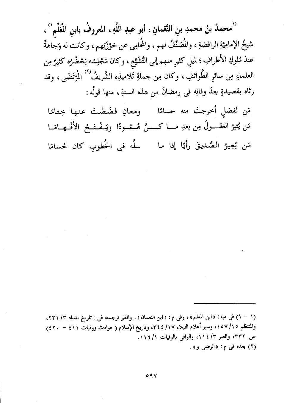 شَيْخُ الْإِمَامِيَّةِ الرَّافِضَةِ، وَالْمُصَنِّفُ لَهُمْ، وَالْمُحَامِي عَنْ حَوْزَتِهِمْ، كَانَتْ لَهُ وَجَاهَةٌ عِنْدَ مُلُوكِ الْأَطْرَافِ، لِمَيْلِ كَثِيرٍ مِنْهُمْ إِلَى التَّشَيُّعِ، وَكَانَ مَجْلِسُهُ يَحْضُرُهُ كَثِيرٌ مِنَ الْعُلَمَاءِ مِنْ سَائِرِ الطَّوَائِفِ، وَكَانَ مِنْ جُمْلَةِ تَلَامِيذِهِ الشَّرِيفُ الْمُرْتَضَى وَقَدْ رَثَاهُ بِقَصِيدَةٍ بَعْدَ وَفَاتِهِ فِي رَمَضَانَ مِنْ هَذِهِ السَّنَةِ، مِنْهَا قَوْلُهُ: