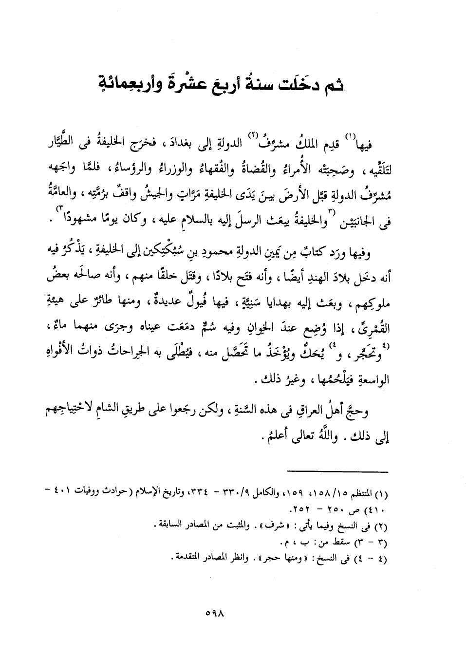 فِيهَا قَدِمَ الْمَلِكُ مُشَرِّفُ الدَّوْلَةِ إِلَى بَغْدَادَ فَخَرَجَ الْخَلِيفَةُ فِي الطَّيَّارِ لِتَلَقِّيهِ، وَصَحِبَتْهُ الْأُمَرَاءُ وَالْقُضَاةُ وَالْفُقَهَاءُ وَالْوُزَرَاءُ وَالرُّؤَسَاءُ، فَلَمَّا وَاجَهَهُ مُشَرِّفُ الدَّوْلَةِ قَبَّلَ الْأَرْضَ بَيْنَ يَدَيِ الْخَلِيفَةِ مَرَّاتٍ وَالْجَيْشُ وَاقِفٌ بِرُمَّتِهِ، وَالْعَامَّةُ فِي الْجَانِبَيْنِ وَالْخَلِيفَةُ يَبْعَثُ الرُّسُلَ إِلَيْهِ بِالسَّلَامِ عَلَيْهِ، وَكَانَ يَوْمًا مَشْهُودًا.