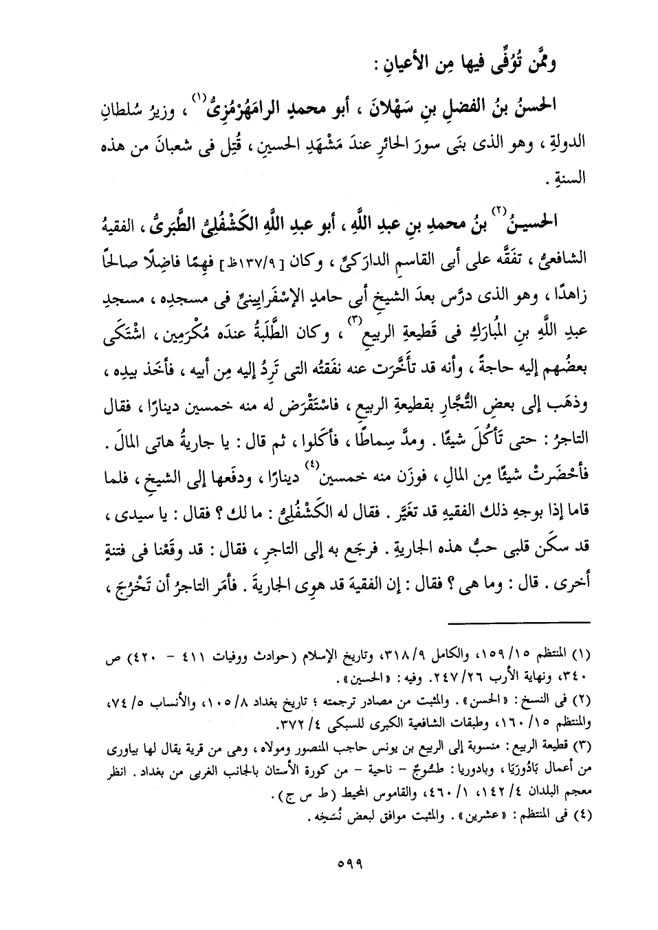 الْفَقِيهُ الشَّافِعِيُّ، تَفَقَّهَ عَلَى أَبِي الْقَاسِمِ الدَّارَكِيِّ، وَكَانَ فَهْمًا فَاضِلًا صَالِحًا زَاهِدًا، وَهُوَ الَّذِي دَرَّسَ بَعْدَ الشَّيْخِ أَبِي حَامِدٍ الْإِسْفَرَايِينِيِّ فِي مَسْجِدِهِ، مَسْجِدِ عَبْدِ اللَّهِ بْنِ الْمُبَارَكِ فِي قَطِيعَةِ الرَّبِيعِ، وَكَانَ الطَّلَبَةُ عِنْدَهُ مُكَرَّمِينَ، اشْتَكَى بَعْضُهُمْ إِلَيْهِ حَاجَةً، وَأَنَّهُ قَدْ تَأَخَرَّتْ عَنْهُ نَفَقَتُهُ الَّتِي تَرِدُ إِلَيْهِ مِنْ أَبِيهِ، فَأَخَذَهُ بِيَدِهِ، وَذَهَبَ إِلَى بَعْضِ التُّجَّارِ بِقَطِيعَةِ الرَّبِيعِ، فَاسْتَقْرَضَ لَهُ مِنْهُ خَمْسِينَ دِينَارًا، فَقَالَ التَّاجِرُ: حَتَّى تَأْكُلَ شَيْئًا. وَمَدَّ سِمَاطًا، فَأَكَلُوا، ثُمَّ قَالَ: يَا جَارِيَةُ هَاتِي الْمَالَ. فَأَحْضَرَتْ شَيْئًا مِنَ الْمَالِ، فَوَزَنَ مِنْهُ خَمْسِينَ دِينَارًا، وَدَفَعَهَا إِلَى الشَّيْخِ، فَلَمَّا قَامَا إِذَا بِوَجْهِ ذَلِكَ الْفَقِيهِ قَدْ تَغَيَّرَ. فَقَالَ لَهُ الْكَشْفُلِيُّ: مَا لَكَ؟ فَقَالَ: يَا سَيِّدِي، قَدْ سَكَنَ قَلْبِي حُبُّ هَذِهِ الْجَارِيَةِ. فَرَجَعَ بِهِ إِلَى التَّاجِرِ، فَقَالَ: قَدْ وَقَعْنَا فِي فِتْنَةٍ أُخْرَى. قَالَ: وَمَا هِيَ؟ فَقَالَ: إِنَّ الْفَقِيهَ قَدْ هَوَى الْجَارِيَةَ. فَأَمَرَ التَّاجِرُ أَنْ تَخْرُجَ،