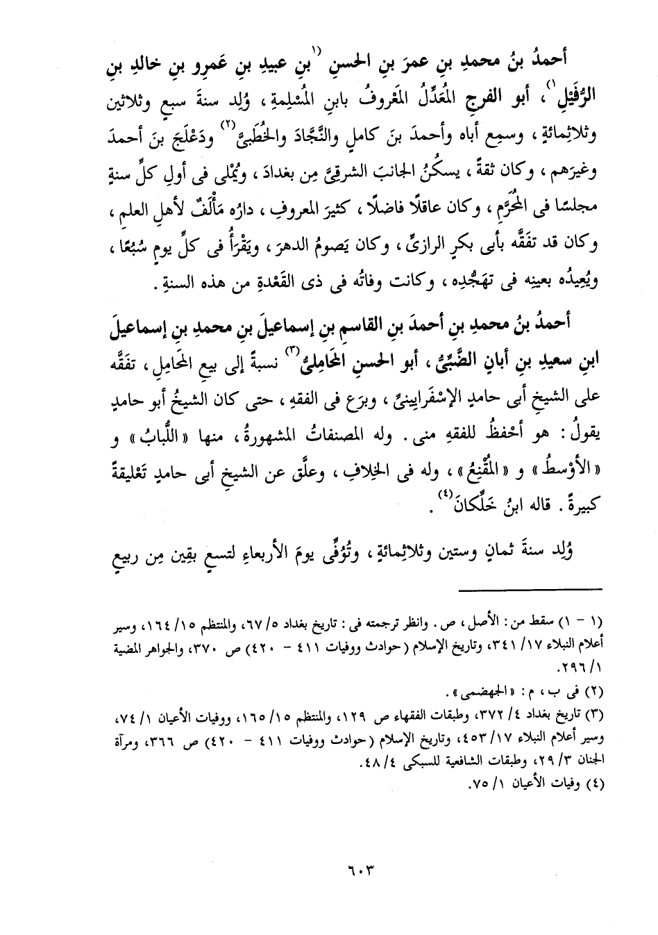الْمَعْرُوفُ بِابْنِ الْمُسْلِمَةِ، وُلِدَ سَنَةَ سَبْعٍ وَثَلَاثِينَ وَثَلَاثِمِائَةٍ، وَسَمِعَ أَبَاهُ وَأَحْمَدَ بْنَ كَامِلٍ وَالنَّجَّادَ وَالْخُطَبِيَّ وَدَعْلَجَ بْنَ أَحْمَدَ وَغَيْرَهُمْ، وَكَانَ ثِقَةً، يَسْكُنُ الْجَانِبَ الشَّرْقِيَّ مِنْ بَغْدَادَ وَيُمْلِي فِي أَوَّلِ كُلِّ سَنَةٍ مَجْلِسًا فِي الْمُحَرَّمِ، وَكَانَ عَاقِلًا فَاضِلًا، كَثِيرَ الْمَعْرُوفِ، دَارُهُ مَأْلَفٌ لِأَهْلِ الْعِلْمِ، وَكَانَ قَدْ تَفَقَّهَ بِأَبِي بَكْرٍ الرَّازِيِّ، وَكَانَ يَصُومُ الدَّهْرَ، وَيَقْرَأُ فِي كُلِّ يَوْمٍ سَبْعًا، وَيُعِيدُهُ بِعَيْنِهِ فِي تَهَجُّدِهِ، وَكَانَتْ وَفَاتُهُ فِي ذِي الْقَعْدَةِ مِنْ هَذِهِ السَّنَةِ.