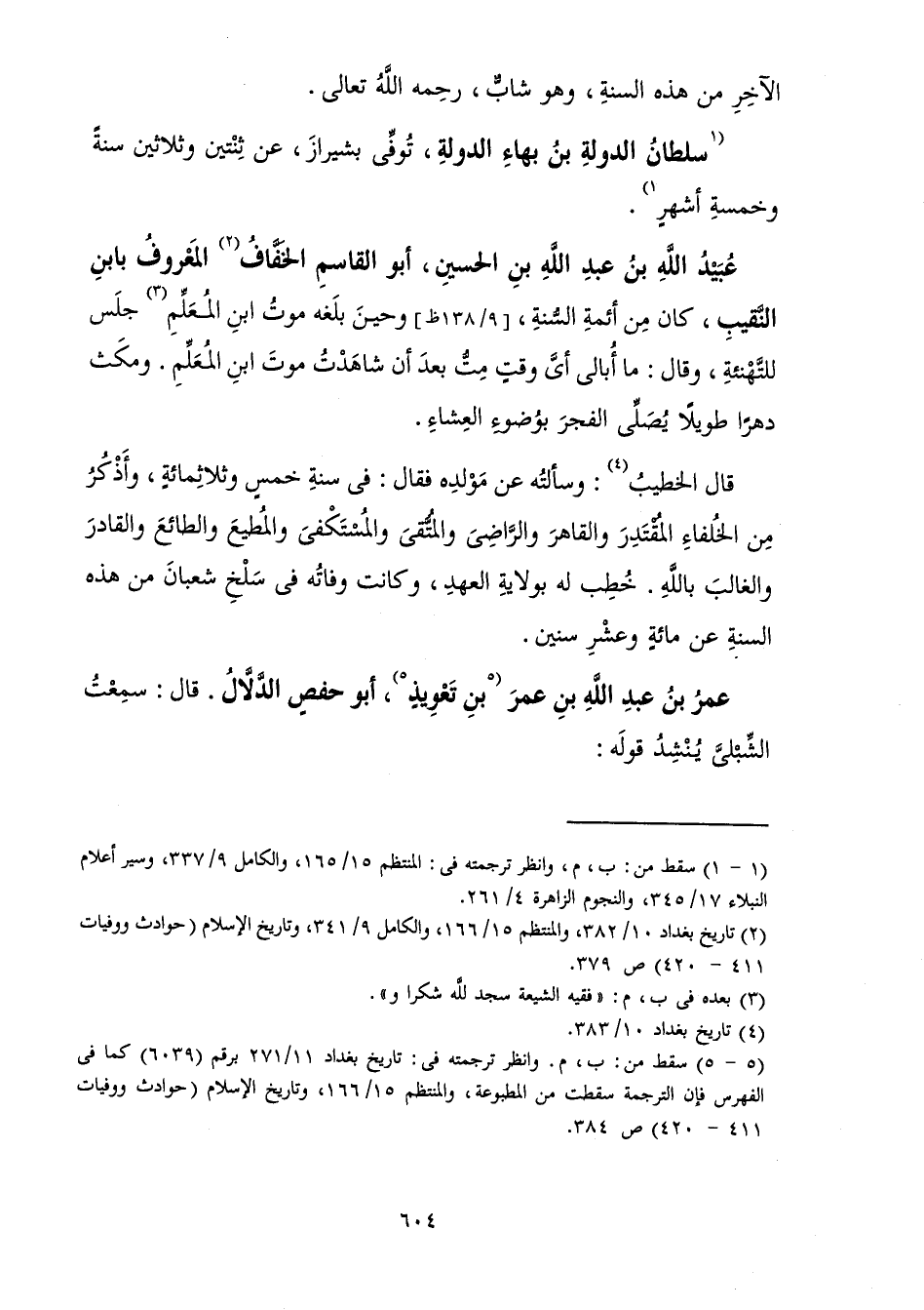 قَالَ الْخَطِيبُ: وَسَأَلْتُهُ عَنْ مَوْلِدِهِ، فَقَالَ: فِي سَنَةِ خَمْسٍ وَثَلَاثِمِائَةٍ، وَأَذْكُرُ مِنَ الْخُلَفَاءِ الْمُقْتَدِرَ وَالْقَاهِرَ وَالرَّاضِيَ وَالْمُتَّقِيَ وَالْمُسْتَكْفِيَ وَالْمُطِيعَ وَالطَّائِعَ وَالْقَادِرَ وَالْغَالِبَ بِاللَّهِ. خُطِبَ لَهُ بِوِلَايَةِ الْعَهْدِ، وَكَانَتْ وَفَاتُهُ فِي سَلْخِ شَعْبَانَ مِنْ هَذِهِ السَّنَةِ عَنْ مِائَةٍ وَعَشْرِ سِنِينَ.