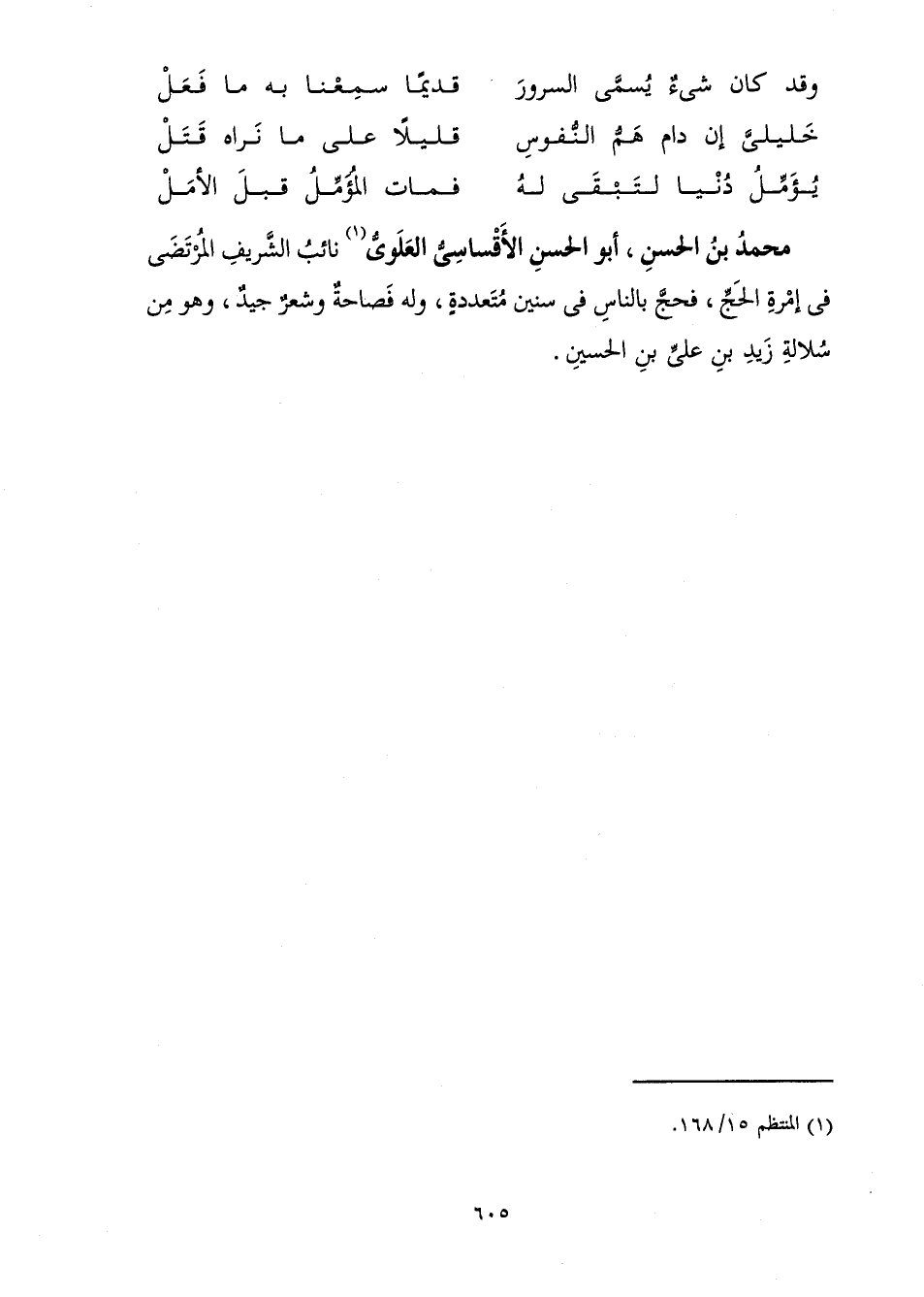 نَائِبُ الشَّرِيفِ الْمُرْتَضَى فِي إِمْرَةِ الْحَجِّ، فَحَجَّ بِالنَّاسِ فِي سِنِينَ مُتَعَدِّدَةٍ، وَلَهُ فَصَاحَةٌ وَشِعْرٌ جَيِّدٌ، وَهُوَ مِنْ سُلَالَةِ زَيْدِ بْنِ عَلِيِّ بْنِ الْحُسَيْنِ.