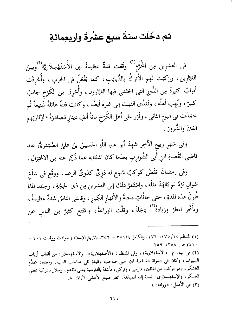 فِي الْعِشْرِينَ مِنَ الْمُحَرَّمِ وَقَعَتْ فِتْنَةٌ بَيْنَ الْأَسْفَهْسِلَارِيَّةِ وَبَيْنَ الْعَيَّارِينَ، وَرَكِبَتْ لَهُمُ الْأَتْرَاكُ بِالدَّبَادِبِ، كَمَا يُفْعَلُ فِي الْحَرْبِ، وَأُحْرِقَتْ أَبْوَابٌ كَثِيرَةٌ مِنَ الدُّورِ الَّتِي احْتَمَى فِيهَا الْعَيَّارُونَ، وَأُحْرِقَ مِنَ الْكَرْخِ جَانِبٌ كَبِيرٌ، وَنُهِبَ أَهْلُهُ، وَتَعَدَّى النَّهْبُ إِلَى غَيْرِهِ أَيْضًا، وَكَانَتْ فِتْنَةً هَائِلَةً شَنِيعَةً، ثُمَّ خَمَدَتْ فِي الْيَوْمِ الثَّانِي، وَقُرِّرَ عَلَى أَهْلِ الْكَرْخِ مِائَةُ أَلْفِ دِينَارٍ مُصَادَرَةً ; لِإِثَارَتِهِمُ الْفِتَنَ وَالشُّرُورَ.