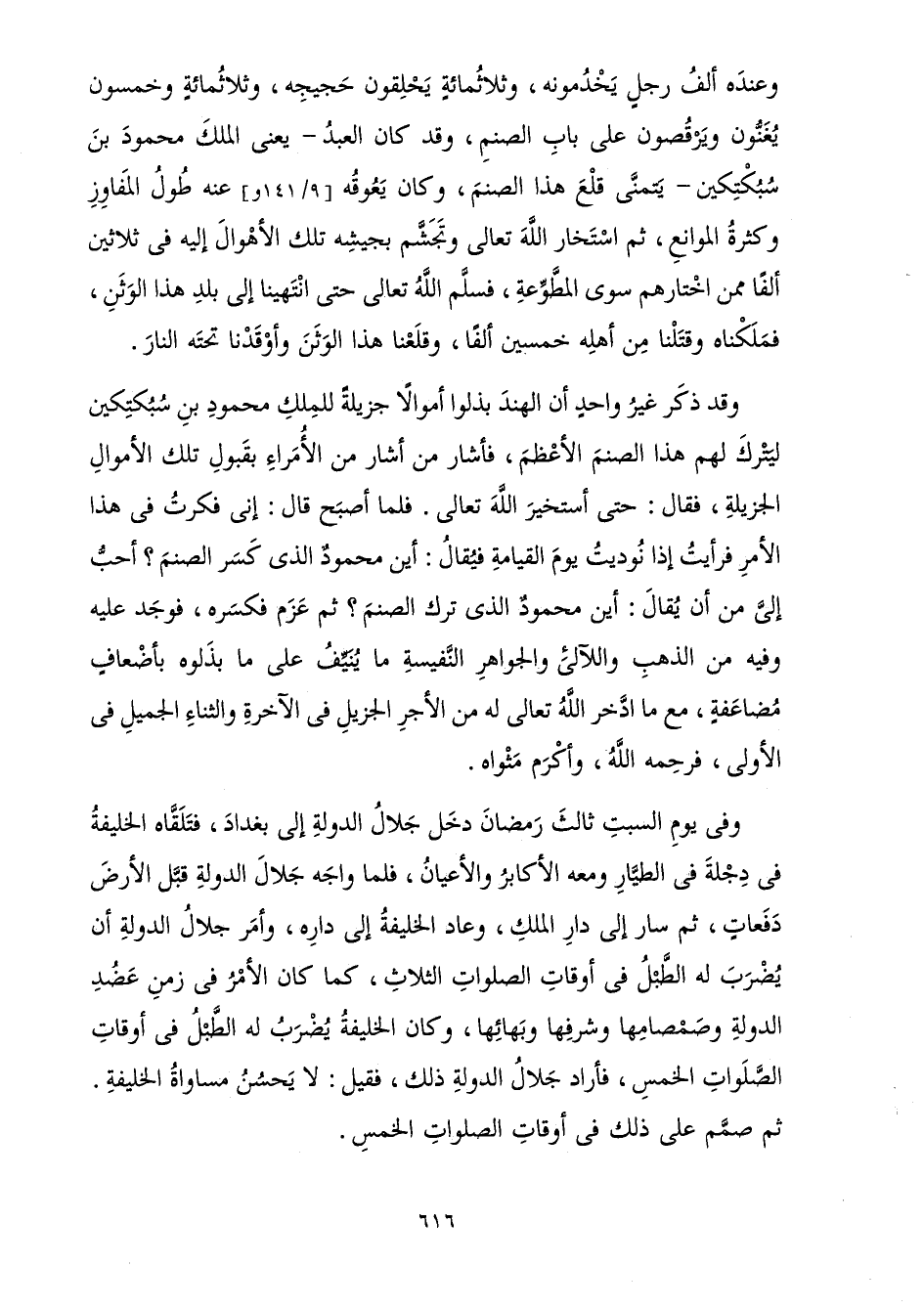 وَعِنْدَهُ أَلْفُ رَجُلٍ يَخْدِمُونَهُ، وَثَلَاثُمِائَةٍ يَحْلِقُونَ حَجِيجِهِ، وَثَلَاثُمِائَةٍ وَخَمْسُونَ يُغَنُّونَ وَيَرْقُصُونَ عَلَى بَابِ الصَّنَمِ، وَقَدْ كَانَ الْعَبْدُ - يَعْنِي الْمَلِكَ مَحْمُودَ بْنَ سُبُكْتِكِينَ - يَتَمَنَّى قَلْعَ هَذَا الصَّنَمِ، وَكَانَ يَعُوقُهُ عَنْهُ طُولُ الْمَفَاوِزِ وَكَثْرَةُ الْمَوَانِعِ، ثُمَّ اسْتَخَارَ اللَّهَ تَعَالَى وَتَجَشَّمَ بِجَيْشِهِ تِلْكَ الْأَهْوَالَ إِلَيْهِ فِي ثَلَاثِينَ أَلْفًا مِمَّنِ اخْتَارَهُمْ سِوَى الْمُطَّوِّعَةِ، فَسَلَّمَ اللَّهُ تَعَالَى حَتَّى انْتَهَيْنَا إِلَى بَلَدِ هَذَا الْوَثَنِ، فَمَلَكْنَاهُ وَقَتَلْنَا مِنْ أَهْلِهِ خَمْسِينَ أَلْفًا، وَقَلَعْنَا هَذَا الْوَثَنَ وَأَوْقَدْنَا تَحْتَهُ النَّارَ.