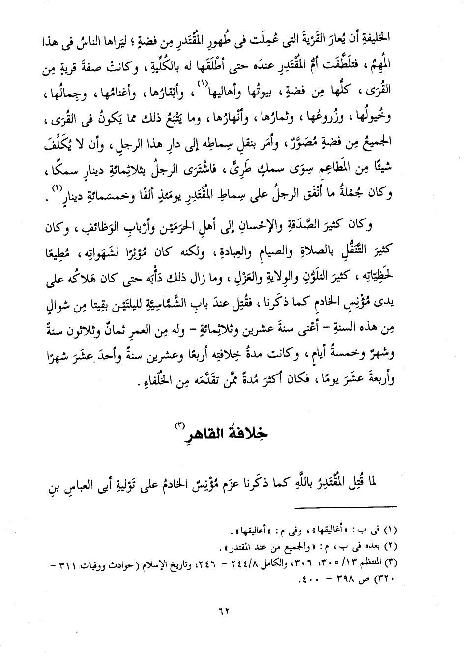 وَكَانَ كَثِيرَ الصَّدَقَةِ وَالْإِحْسَانِ إِلَى أَهْلِ الْحَرَمَيْنِ وَأَرْبَابِ الْوَظَائِفِ، وَكَانَ كَثِيرَ التَّنَفُّلِ بِالصَّلَاةِ وَالصَّوْمِ وَالْعِبَادَةِ، وَلَكِنَّهُ كَانَ مُؤْثِرًا لِشَهَوَاتِهِ، مُطِيعًا لِحَظِيَّاتِهِ، كَثِيرَ التَّلَوُّنِ وَالْوِلَايَةِ وَالْعَزْلِ، وَمَا زَالَ ذَلِكَ دَأْبَهُ حَتَّى كَانَ هَلَاكُهُ عَلَى يَدَيْ مُؤْنِسٍ الْخَادِمِ كَمَا ذَكَرْنَا، فَقُتِلَ عِنْدَ بَابِ الشَّمَّاسِيَّةِ لِلَيْلَتَيْنِ بَقِيَتَا مِنْ شَوَّالٍ مِنْ هَذِهِ السَّنَةِ - أَعْنِي سَنَةَ عِشْرِينَ وَثَلَاثِمِائَةٍ - وَلَهُ مِنَ الْعُمُرِ ثَمَانٍ وَثَلَاثُونَ سَنَةً وَشَهْرٌ وَخَمْسَةُ أَيَّامٍ، وَكَانَتْ مُدَّةُ خِلَافَتِهِ أَرْبَعًا وَعِشْرِينَ سَنَةً وَأَحَدَ عَشَرَ شَهْرًا وَأَرْبَعَةَ عَشَرَ يَوْمًا، فَكَانَ أَكْثَرَ مُدَّةً مِمَّنْ تَقَدَّمَهُ مِنَ الْخُلَفَاءِ.