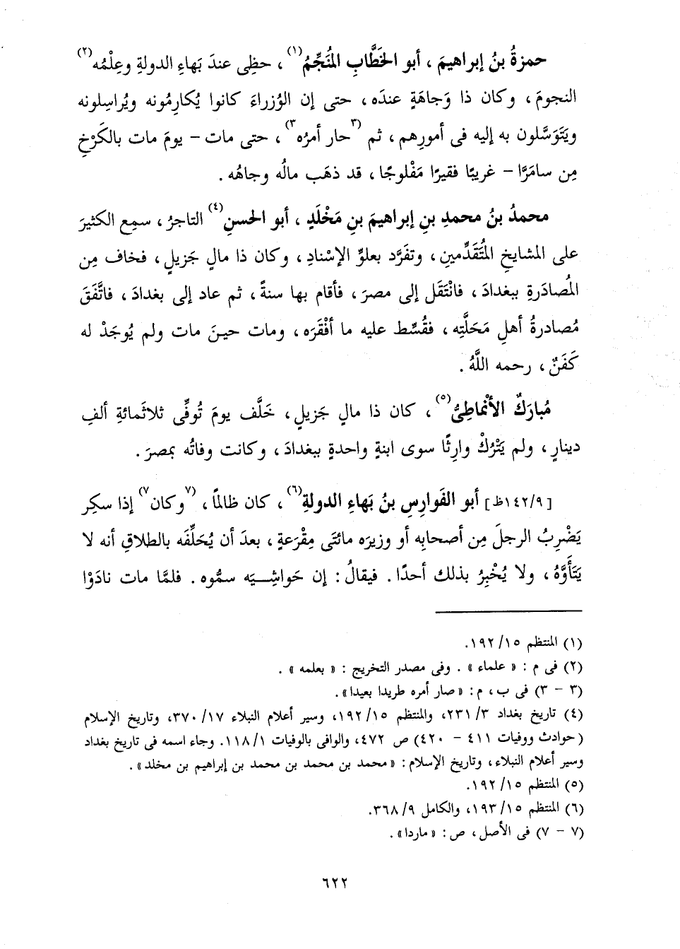 حَمْزَةُ بْنُ إِبْرَاهِيمَ، أَبُو الْخَطَّابِ الْمُنَجِّمُ حَظِيَ عِنْدَ بَهَاءِ الدَّوْلَةِ وَعَلَّمَهُ النُّجُومَ، وَكَانَ لَهُ ذَا وَجَاهَةٍ عِنْدَهُ، حَتَّى أَنَّ الْوُزَرَاءَ كَانُوا يُكَارِمُونَهُ وَيُرَاسِلُونَهُ وَيَتَوَسَّلُونَ بِهِ إِلَيْهِ فِي أُمُورِهِمْ، ثُمَّ حَارَ أَمْرُهُ حَتَّى مَاتَ - يَوْمَ مَاتَ بِالْكَرْخِ مِنْ سَامَرَّا - غَرِيبًا فَقِيرًا مَفْلُوجًا، قَدْ ذَهَبَ مَالُهُ وَجَاهُهُ.