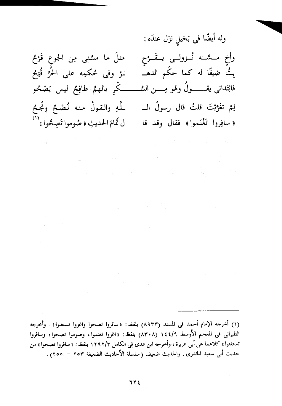 " «سَافَرُوا تَغْنَمُوا» " فَقَالَ وَقَدْ قَا ... لَ تَمَامَ الْحَدِيثِ «صُومُوا تَصِحُّوَا»