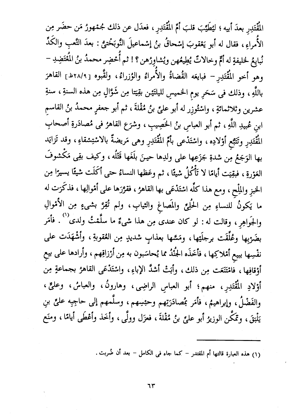 الْمُقْتَدِرِ بَعْدَ أَبِيهِ ; لِيُطَيِّبَ قَلْبَ أُمِّ الْمُقْتَدِرِ، فَعَدَلَ عَنْ ذَلِكَ جُمْهُورُ مَنْ حَضَرَ مِنَ الْأُمَرَاءِ، فَقَالَ لَهُ أَبُو يَعْقُوبَ إِسْحَاقُ بْنُ إِسْمَاعِيلَ النُّوبَخْتِيُّ: بَعْدَ التَّعَبِ وَالْكَدِّ نُبَايِعُ لِخَلِيفَةٍ لَهُ أَمٌّ وَخَالَاتٌ يُطِيعُهُنَّ وَيُشَاوِرُهُنَّ؟! ثُمَّ أَحْضَرَ مُحَمَّدَ بْنَ الْمُعْتَضِدِ - وَهُوَ أَخُو الْمُقْتَدِرِ - فَبَايَعَهُ الْقُضَاةُ وَالْأُمَرَاءُ وَالْوُزَرَاءُ، وَلَقَّبُوهُ الْقَاهِرَ بِاللَّهِ، وَذَلِكَ فِي سَحَرِ يَوْمِ الْخَمِيسِ لِلَيْلَتَيْنِ بَقِيَتَا مِنْ شَوَّالٍ مِنْ هَذِهِ السَّنَةِ، سَنَةَ عِشْرِينَ وَثَلَاثِمِائَةٍ، وَاسْتُوزِرَ لَهُ أَبُو عَلِيِّ بْنُ مُقْلَةَ، ثُمَّ أَبُو جَعْفَرٍ مُحَمَّدُ بْنُ الْقَاسِمِ بْنِ عُبَيْدِ اللَّهِ ثُمَّ أَبُو الْعَبَّاسِ بْنُ الْخَصِيبُ وَشَرَعَ الْقَاهِرُ فِي مُصَادَرَةِ أَصْحَابِ الْمُقْتَدِرِ وَتَتَبُّعِ أَوْلَادِهِ، وَاسْتَدْعَى بِأُمِّ الْمُقْتَدِرِ وَهِيَ مَرِيضَةٌ بِالِاسْتِسْقَاءِ، وَقَدْ تَزَايَدَ بِهَا الْوَجَعُ مِنْ شِدَّةِ جَزَعِهَا عَلَى وَلَدِهَا حِينَ بَلَغَهَا قَتْلُهُ، وَكَيْفَ بَقِيَ مَكْشُوفَ الْعَوْرَةِ، فَبَقِيَتْ أَيَّامًا لَا تَأْكُلُ شَيْئًا، ثُمَّ وَعَظَهَا النِّسَاءُ حَتَّى أَكَلَتْ شَيْئًا يَسِيرًا مِنَ الْخُبْزِ وَالْمِلْحِ، وَمَعَ هَذَا كُلِّهِ اسْتَدْعَى بِهَا الْقَاهِرُ، فَقَرَّرَهَا عَلَى أَمْوَالِهَا، فَذَكَرَتْ لَهُ مَا يَكُونُ لِلنِّسَاءِ مِنَ الْحُلِيِّ وَالْمَصَاغِ وَالثِّيَابِ، وَلَمْ تُقِرَّ بِشَيْءٍ مِنَ الْأَمْوَالِ وَالْجَوَاهِرِ، وَقَالَتْ لَهُ: لَوْ كَانَ عِنْدِي مِنْ هَذَا شَيْءٌ مَا سَلَّمْتُ وَلَدِي. فَأَمَرَ بِضَرْبِهَا وَعُلِّقَتْ بِرِجْلَيْهَا وَمَسَّهَا بِعَذَابٍ شَدِيدٍ مِنَ الْعُقُوبَةِ، وَأَشْهَدَتْ عَلَى نَفْسِهَا بِبَيْعِ أَمْلَاكِهَا، فَأَخَذَهُ الْجُنْدُ مِمَّا يُحَاسِبُونَ بِهِ مِنْ أَرْزَاقِهِمْ، وَأَرَادَهَا عَلَى بَيْعِ أَوْقَافِهَا، فَامْتَنَعَتْ مِنْ ذَلِكَ، وَأَبَتْ أَشَدَّ الْإِبَاءِ، وَاسْتَدْعَى الْقَاهِرُ بِجَمَاعَةٍ مِنْ أَوْلَادِ الْمُقْتَدِرِ، مِنْهُمْ أَبُو الْعَبَّاسِ الرَّاضِي، وَهَارُونُ، وَالْعَبَّاسُ، وَعَلِيٌّ، وَالْفَضْلُ، وَإِبْرَاهِيمُ، فَأَمَرَ بِمُصَادَرَتِهِمْ وَحَبْسِهِمْ وَسَلَّمَهُمْ إِلَى حَاجِبِهِ عَلِيِّ بْنِ يَلْبَقَ، وَتَمَكَّنَ الْوَزِيرُ أَبُو عَلِيِّ بْنُ مُقْلَةَ، فَعَزَلَ وَوَلَّى، وَأَخَذَ وَأَعْطَى أَيَّامًا، وَمَنَعَ