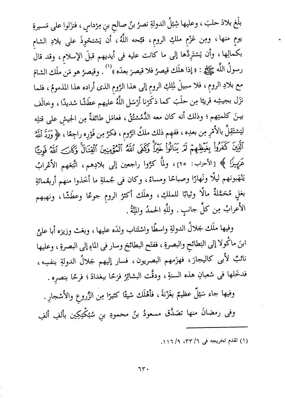بَلَغَ بِلَادَ حَلَبَ وَعَلَيْهَا شِبْلُ الدَّوْلَةِ نَصْرُ بْنُ صَالِحِ بْنِ مِرْدَاسٍ، فَنَزَلُوا عَلَى مَسِيرَةِ يَوْمٍ مِنْهَا، وَمِنْ عَزْمِ مَلِكِ الرُّومِ - قَبَّحَهُ اللَّهُ - أَنْ يَسْتَحْوِذَ عَلَى بِلَادِ الشَّامِ بِكَمَالِهَا، وَأَنْ يَسْتَرِدَّهَا إِلَى مَا كَانَتْ عَلَيْهِ فِي أَيْدِيهِمْ قَبْلَ الْإِسْلَامِ، وَقَدْ قَالَ رَسُولُ اللَّهِ صَلَّى اللَّهُ عَلَيْهِ وَسَلَّمَ «إِذَا هَلَكَ قَيْصَرُ فَلَا قَيْصَرَ بَعْدَهُ» وَقَيْصَرُ هُوَ مَنْ مَلَكَ الشَّامَ مَعَ بِلَادِ الرُّومِ، فَلَا سَبِيلَ لِمَلِكِ الرُّومِ إِلَى هَذَا الرَّوْمِ الَّذِي أَرَادَهُ هَذَا الْمَذْمُومُ، فَلَمَّا نَزَلَ بِجَيْشِهِ قَرِيبًا مِنْ حَلَبَ كَمَا ذَكَرْنَا، أَرْسَلَ اللَّهُ عَلَيْهِمْ عَطَشًا شَدِيدًا، وَخَالَفَ بَيْنَ كَلِمَتِهِمْ ; وَذَلِكَ أَنَّهُ كَانَ مَعَهُ الدُّمُسْتُقُ، فَعَامَلَ طَائِفَةً مِنَ الْجَيْشِ عَلَى قَتْلِهِ لِيَسْتَقِلَّ بِالْأَمْرِ مِنْ بَعْدِهِ، فَفَهِمَ ذَلِكَ مَلِكُ الرُّومِ، فَكَرَّ مِنْ فَوْرِهِ رَاجِعًا {وَرَدَّ اللَّهُ الَّذِينَ كَفَرُوا بِغَيْظِهِمْ لَمْ يَنَالُوا خَيْرًا وَكَفَى اللَّهُ الْمُؤْمِنِينَ الْقِتَالَ وَكَانَ اللَّهُ قَوِيًّا عَزِيزًا} [الأحزاب: 25] وَلَمَّا كَرُّوا رَاجِعِينَ إِلَى بِلَادِهِمْ، اتَّبَعَهُمُ الْأَعْرَابُ يَنْهَبُونَهُمْ لَيْلًا وَنَهَارًا وَصَبَاحًا وَمَسَاءً، وَهَلَكَ أَكْثَرُ الرُّومِ جُوعًا وَعَطَشًا، وَنَهْبَهُمُ الْأَعْرَابُ مِنْ كُلِّ جَانِبٍ. وَلِلَّهِ الْحَمْدُ وَالْمِنَّةُ.