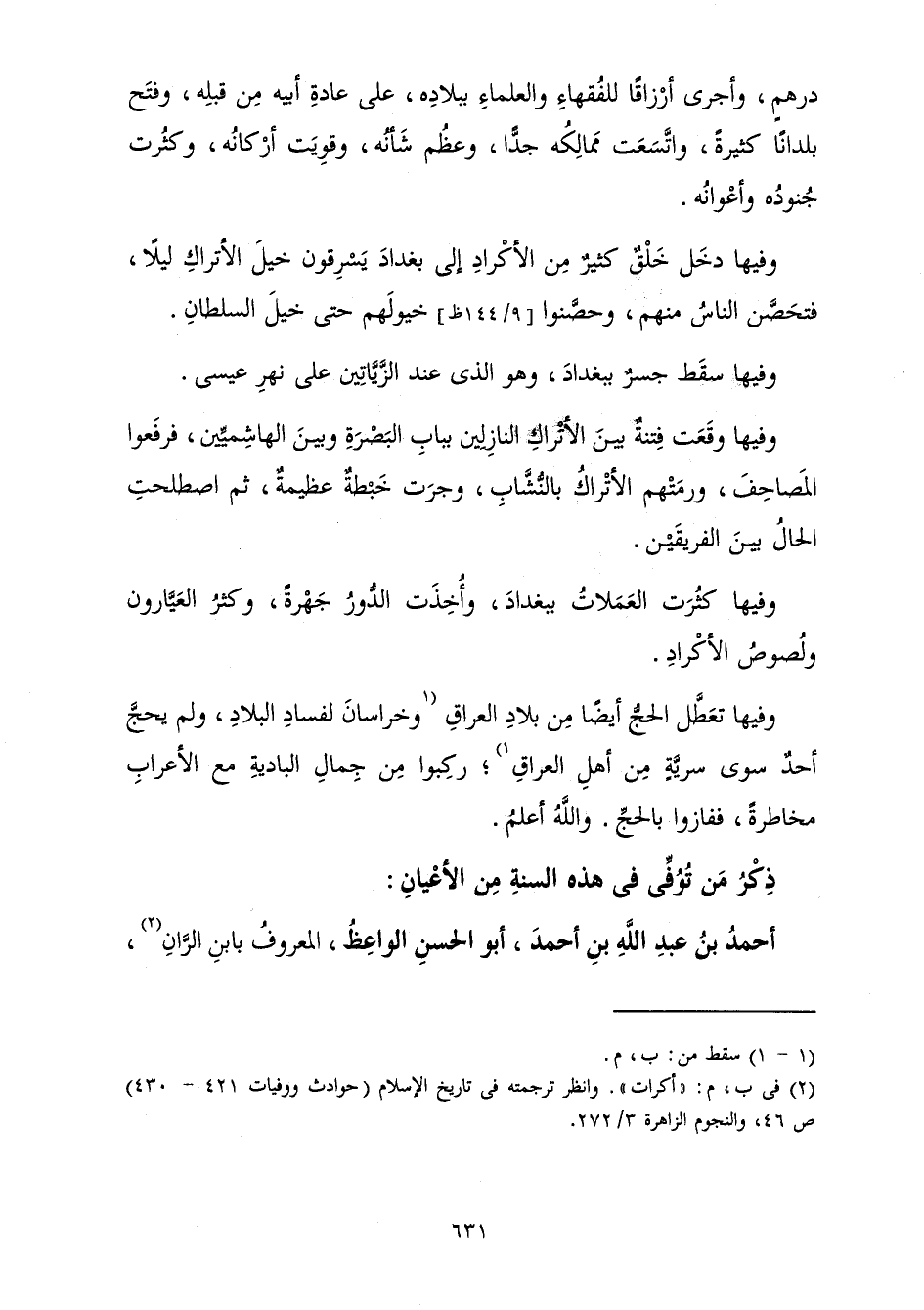 وَفِيهَا كَثُرَتِ الْعَمَلَاتُ بِبَغْدَادَ، وَأُخِذَتِ الدُّورُ جَهْرَةً، وَكَثُرَ الْعَيَّارُونَ وَلُصُوصُ الْأَكْرَادِ.