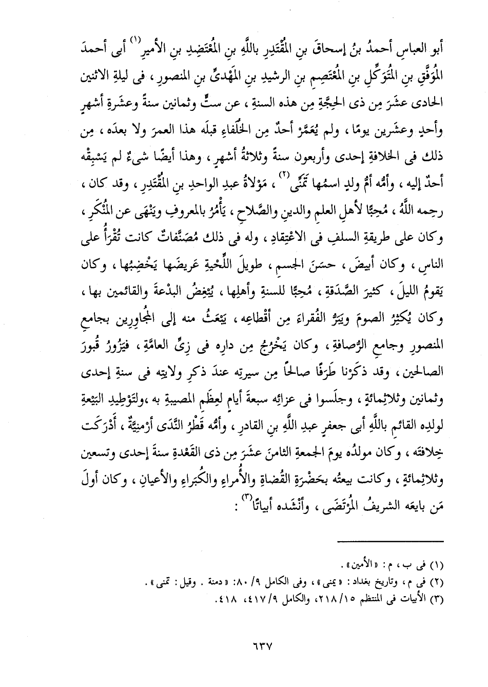 أَبُو الْعَبَّاسِ أَحْمَدُ بْنُ الْمُقْتَدِرِ بِاللَّهِ بْنِ الْمُعْتَضِدِ بْنِ الْأَمِيرِ أَبِي أَحْمَدَ الْمُوَفَّقِ بْنِ الْمُتَوَكِّلِ بْنِ الْمُعْتَصِمِ بْنِ الرَّشِيدِ بْنِ الْمَهْدِيِّ بْنِ الْمَنْصُورِ، فِي لَيْلَةِ الِاثْنَيْنِ الْحَادِي عَشَرَ مِنْ ذِي الْحِجَّةِ مِنْ هَذِهِ السَّنَةِ عَنْ سِتٍّ وَثَمَانِينَ سَنَةً وَعَشَرَةِ أَشْهُرٍ وَأَحَدٍ وَعِشْرِينَ يَوْمًا، وَلَمْ يُعَمَّرْ أَحَدٌ مِنَ الْخُلَفَاءِ قَبْلَهُ هَذَا الْعُمُرَ وَلَا بَعْدَهُ، مِنْ ذَلِكَ فِي الْخِلَافَةِ إِحْدَى وَأَرْبَعُونَ سَنَةً وَثَلَاثَةُ أَشْهُرٍ، وَهَذَا أَيْضًا شَيْءٌ لَمْ يَسْبِقْهُ أَحَدٌ إِلَيْهِ، وَأُمُّهُ أُمُّ وَلَدٍ اسْمُهَا تَمَنِّي، مَوْلَاةُ عَبْدِ الْوَاحِدِ بْنِ الْمُقْتَدِرِ، وَقَدْ كَانَ رَحِمَهُ اللَّهُ مُحِبًّا لِأَهْلِ الْعِلْمِ وَالدِّينِ وَالصَّلَاحِ، يَأْمُرُ بِالْمَعْرُوفِ وَيَنْهَى عَنِ الْمُنْكَرِ، وَكَانَ عَلَى طَرِيقَةِ السَّلَفِ فِي الِاعْتِقَادِ، وَلَهُ فِي ذَلِكَ مُصَنَّفَاتٌ كَانَتْ تُقْرَأُ عَلَى النَّاسِ، وَكَانَ أَبْيَضَ، حَسَنَ الْجِسْمِ، طَوِيلَ اللِّحْيَةِ عَرِيضَهَا يَخْضِبُهَا، وَكَانَ يَقُومُ اللَّيْلَ، كَثِيرَ الصَّدَقَةِ، مُحِبًّا لِلسُّنَّةِ وَأَهْلِهَا، يَبْغَضُ الْبِدْعَةَ وَالْقَائِمَيْنِ بِهَا، وَكَانَ يُكْثِرُ الصَّوْمَ، وَيَبَرُّ الْفُقَرَاءَ مِنْ أَقْطَاعِهِ، يَبْعَثُ مِنْهُ إِلَى الْمُجَاوِرِينَ بِجَامِعِ الْمَنْصُورِ وَجَامِعِ الرُّصَافَةِ، وَكَانَ يَخْرُجُ مِنْ دَارِهِ فِي زِيِّ الْعَامَّةِ، فَيَزُورُ قُبُورَ الصَّالِحِينَ، وَقَدْ ذَكَرْنَا طَرَفًا صَالِحًا مَنْ سِيرَتِهِ عِنْدَ ذِكْرِ وِلَايَتِهِ فِي سَنَةِ إِحْدَى وَثَمَانِينَ وَثَلَاثِمِائَةٍ، وَجَلَسُوا فِي عَزَائِهِ سَبْعَةَ أَيَّامٍ لِعِظَمِ الْمُصِيبَةِ بِهِ، وَلِتَوْطِيدِ الْبَيْعَةِ لِوَلَدِهِ الْقَائِمِ بِاللَّهِ أَبِي جَعْفَرٍ عَبْدِ اللَّهِ بْنِ الْقَادِرِ، وَأُمُّهُ قَطْرُ النَّدَى أَرْمَنِيَّةٌ، أَدْرَكَتْ خِلَافَتَهُ. وَكَانَ مَوْلِدُهُ يَوْمَ الْجُمُعَةِ الثَّامِنَ عَشَرَ مِنْ ذِي الْقَعْدَةِ سَنَةَ إِحْدَى وَتِسْعِينَ وَثَلَاثِمِائَةٍ، وَكَانَتْ بَيْعَتُهُ بِحَضْرَةِ الْقُضَاةِ وَالْأُمَرَاءِ وَالْكُبَرَاءِ وَالْأَعْيَانِ، وَكَانَ أَوَّلَ مَنْ بَايَعَهُ الشَّرِيفُ الْمُرْتَضَى وَأَنْشَدَهُ أَبْيَاتًا: