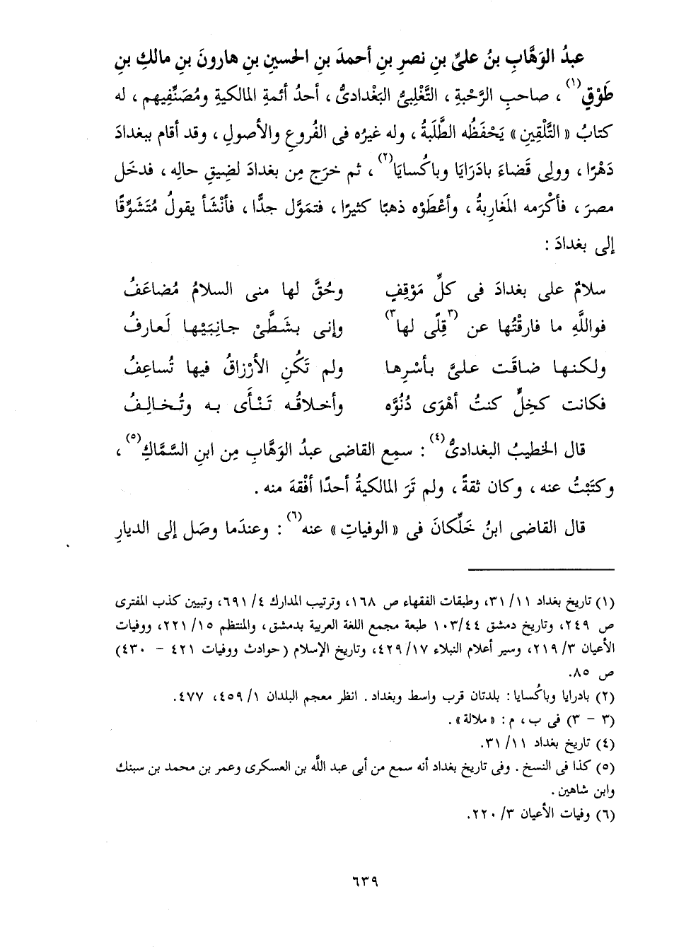 صَاحِبُ الرَّحْبَةِ، التَّغْلِبِيُّ الْبَغْدَادِيُّ، أَحَدُ أَئِمَّةِ الْمَالِكِيَّةِ وَمُصَنِّفِيهِمْ، لَهُ كِتَابُ " التَّلْقِينِ " يَحْفَظُهُ الطَّلَبَةُ، وَلَهُ غَيْرُهُ فِي الْفُرُوعِ وَالْأُصُولِ، وَقَدْ أَقَامَ بِبَغْدَادَ دَهْرًا، وَوَلِيَ قَضَاءَ بَادَرَايَا وَبَاكُسَايَا، ثُمَّ خَرَجَ مِنْ بَغْدَادَ لِضِيقِ حَالِهِ، فَدَخَلَ مِصْرَ، فَأَكْرَمَهُ الْمَغَارِبَةُ، وَأَعْطَوْهُ ذَهَبًا كَثِيرًا، فَتَمَوَّلَ جَدًّا، فَأَنْشَأَ يَقُولُ مُتَشَوِّقًا إِلَى بَغْدَادَ: