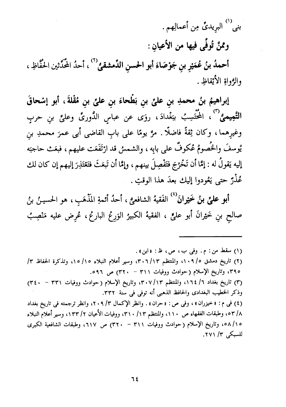 الْمُحْتَسِبُ بِبَغْدَادَ، رَوَى عَنْ عَبَّاسٍ الدُّورِيِّ وَعَلِيِّ بْنِ حَرْبٍ وَغَيْرِهِمَا، وَكَانَ ثِقَةً فَاضِلًا، مَرَّ يَوْمًا عَلَى بَابِ الْقَاضِي أَبِي عُمَرَ مُحَمَّدِ بْنِ يُوسُفَ وَالْخُصُومُ عُكُوفٌ عَلَى بَابِهِ، وَالشَّمْسُ قَدِ ارْتَفَعَتْ عَلَيْهِمْ، فَبَعَثَ حَاجِبَهُ إِلَيْهِ يَقُولُ لَهُ: إِمَّا أَنْ تَخْرُجَ فَتَفْصِلَ بَيْنَهُمْ، وَإِمَّا أَنْ تَبْعَثَ فَتَعْتَذِرَ إِلَيْهِمْ إِنْ كَانَ لَكَ عُذْرٌ، حَتَّى يَعُودُوا إِلَيْكَ بَعْدَ هَذَا الْوَقْتِ.