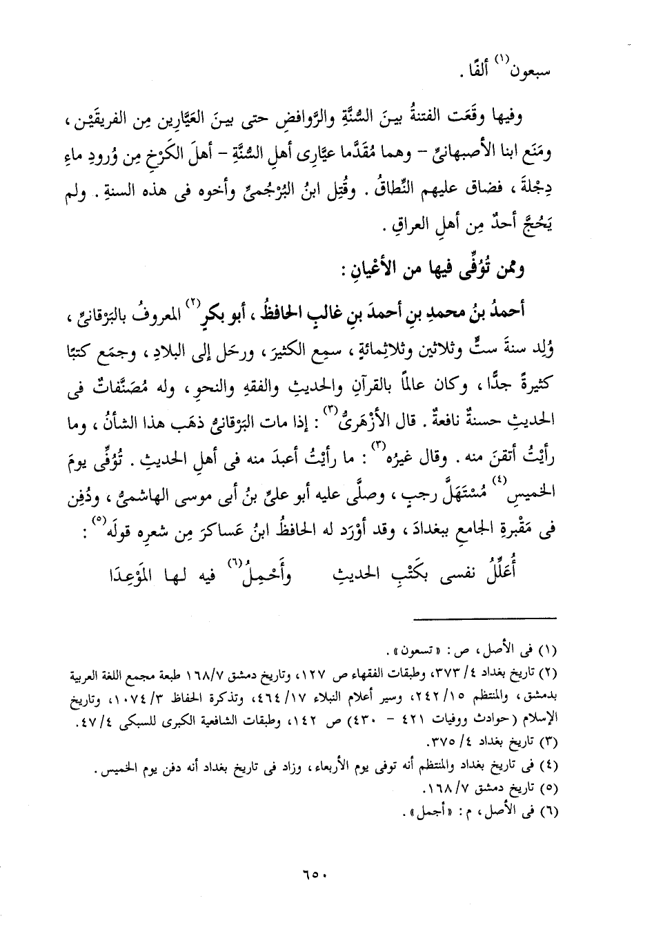 الْمَعْرُوفُ بِالْبَرْقَانِيِّ، وُلِدَ سَنَةَ ثَلَاثٍ وَثَلَاثِينَ وَثَلَاثِمِائَةٍ، سَمِعَ الْكَثِيرَ، وَرَحَلَ إِلَى الْبِلَادِ، وَجَمَعَ كُتُبًا كَثِيرَةً جِدًّا، وَكَانَ عَالِمًا بِالْقُرْآنِ وَالْحَدِيثِ وَالْفِقْهِ وَالنَّحْوِ، وَلَهُ مُصَنَّفَاتٌ فِي الْحَدِيثِ حَسَنَةٌ نَافِعَةٌ. قَالَ الْأَزْهَرِيُّ: إِذَا مَاتَ الْبَرْقَانِيُّ ذَهَبَ هَذَا الشَّأْنُ، وَمَا رَأَيْتُ أَتْقَنَ مِنْهُ. وَقَالَ غَيْرُهُ: مَا رَأَيْتُ أَعْبَدَ مِنْهُ فِي أَهْلِ الْحَدِيثِ. تُوُفِّيَ يَوْمَ الْخَمِيسِ مُسْتَهَلِّ رَجَبٍ، وَصَلَّى عَلَيْهِ أَبُو عَلِيِّ بْنُ أَبِي مُوسَى الْهَاشِمِيُّ، وَدُفِنَ فِي مَقْبَرَةِ الْجَامِعِ بِبَغْدَادَ، وَقَدْ أَوْرَدَ لَهُ الْحَافِظُ ابْنُ عَسَاكِرَ مِنْ شَعْرِهِ قَوْلَهُ: