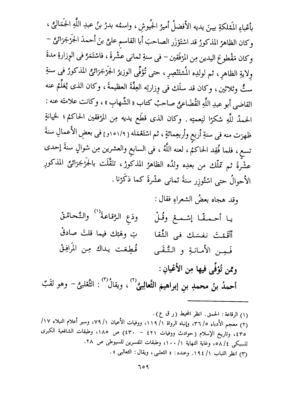 بِأَعْبَاءِ الْمَمْلَكَةِ بَيْنَ يَدَيْهِ الْأَفْضَلُ أَمِيرُ الْجُيُوشِ، وَاسْمُهُ بَدْرُ بْنُ عَبْدِ اللَّهِ الْجَمَالِيُّ، وَكَانَ الظَّاهِرُ الْمَذْكُورُ قَدِ اسْتَوْزَرَ الصَّاحِبَ أَبَا الْقَاسِمِ عَلِيَّ بْنَ أَحْمَدَ الْجَرْجَرَائِيَّ - وَكَانَ مَقْطُوعَ الْيَدَيْنِ مِنَ الْمِرْفِقَيْنِ - فِي سَنَةِ ثَمَانِيَ عَشْرَةَ، فَاسْتَمَرَّ فِي الْوِزَارَةِ مُدَّةَ وِلَايَةِ الظَّاهِرِ، ثُمَّ لِوَلَدِهِ الْمُسْتَنْصِرِ، حَتَّى تُوُفِّيَ الْوَزِيرُ الْجَرْجَرَائِيُّ الْمَذْكُورُ فِي سَنَةِ سِتٍّ وَثَلَاثِينَ، وَكَانَ قَدْ سَلَكَ فِي وِزَارَتِهِ الْعِفَّةَ الْعَظِيمَةَ، وَكَانَ الَّذِي يُعَلِّمُ عَنْهُ الْقَاضِي أَبُو عَبْدِ اللَّهِ الْقُضَاعِيُّ صَاحِبُ كِتَابِ " الشِّهَابِ "، وَكَانَتْ عَلَامَتَهُ عَنْهُ: الْحَمْدُ لِلَّهِ شُكْرًا لِنِعْمَتِهِ. وَكَانَ الَّذِي قَطَعَ يَدَيْهِ مِنَ الْمِرْفِقَيْنِ الْحَاكِمُ ; لِخِيَانَةٍ ظَهَرَتْ مِنْهُ فِي سَنَةِ أَرْبَعٍ وَأَرْبَعِمِائَةٍ، ثُمَّ اسْتَعْمَلَهُ فِي بَعْضِ الْأَعْمَالِ سَنَةَ تِسْعٍ، فَلَمَّا فُقِدَ الْحَاكِمُ - لَعَنَهُ اللَّهُ - فِي السَّابِعِ وَالْعِشْرِينَ مِنْ شَوَّالٍ سَنَةَ إِحْدَى عَشْرَةَ، ثُمَّ تَمَلَّكَ مِنْ بَعْدِهِ وَلَدُهُ الظَّاهِرُ الْمَذْكُورُ، تَنَقَّلَتْ بِالْجَرْجَرَائِيِّ الْمَذْكُورِ الْأَحْوَالُ حَتَّى اسْتَوْزَرَ سَنَةَ ثَمَانِيَ عَشْرَةَ كَمَا ذَكَرْنَا.